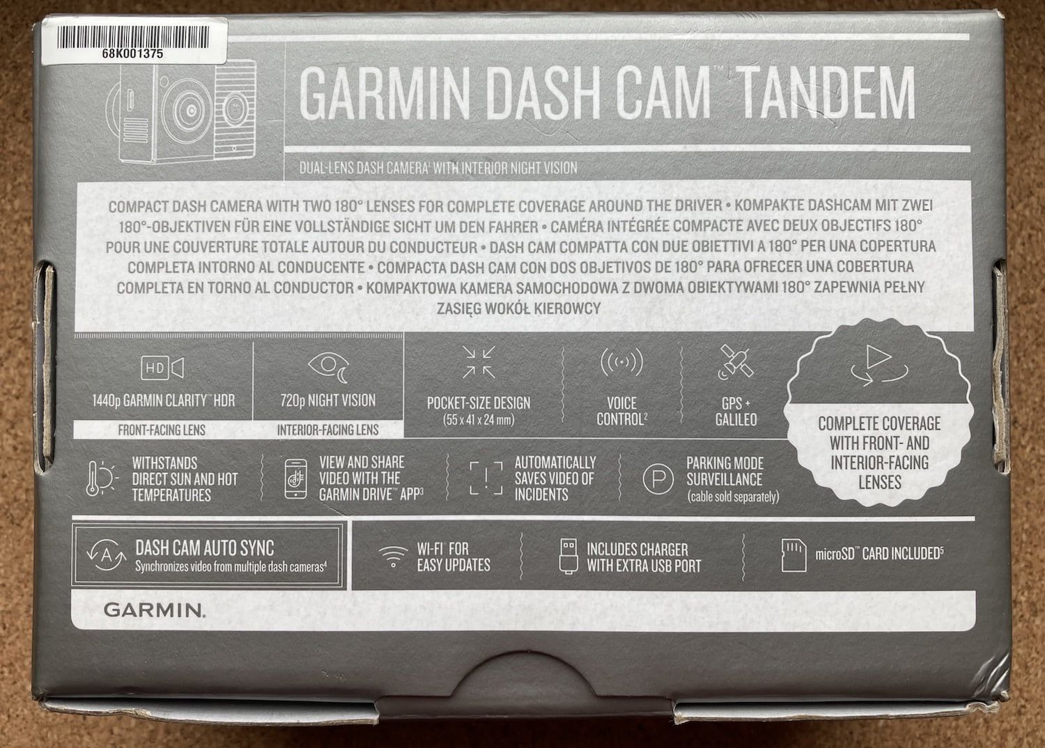 W typowym dla produktów Garmin srebrnym pudełku znajdują się: kamera, karta pamięci microSD po pojemności 16GB, kabel zasilający USB, przejściówka do gniazda zapalniczki z dwoma gniazdami USB, uchwyt magnetyczny, kabel USB do transmisji danych oraz instrukcja obsługi.