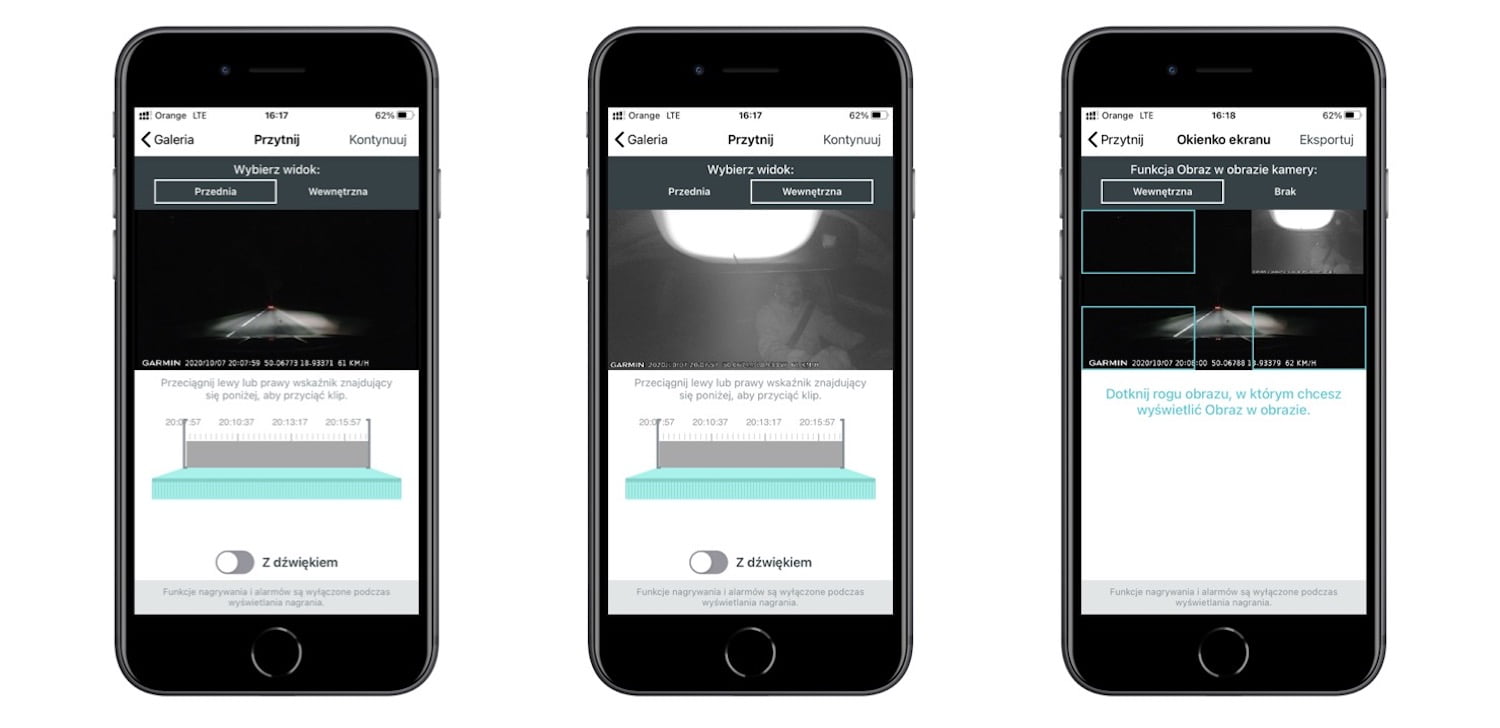 Aplikacja pozwala na podstawową obróbkę materiału wideo. Można przyciąć plik, połączyć nagrania itp. Do wyboru jest obraz z przedniej kamery, z tylnej kamery lub z obu kamer na raz, osadzonych na zasadzie obraz w obrazie. Przy czym obraz z drugiej kamery można umieścić w dowolnym rogu obrazu kamery przedniej. Niestety aplikacja Garmin Drive jest nieco powolna i edycja dłuższych niż minutę materiałów wideo zajmuje sporo czasu nawet na szybkim telefonie.