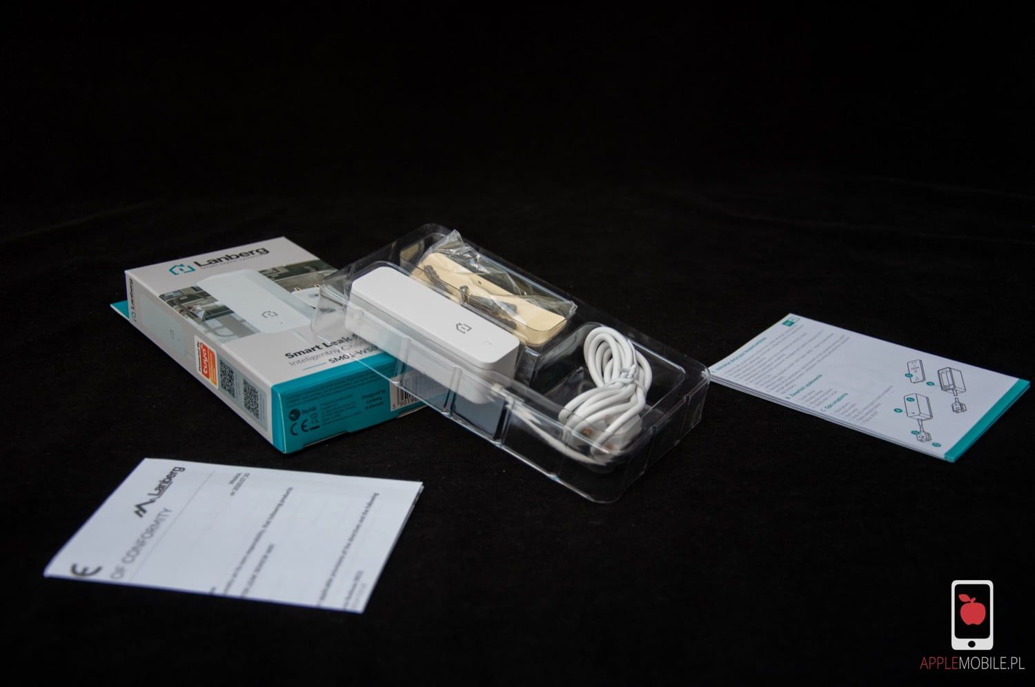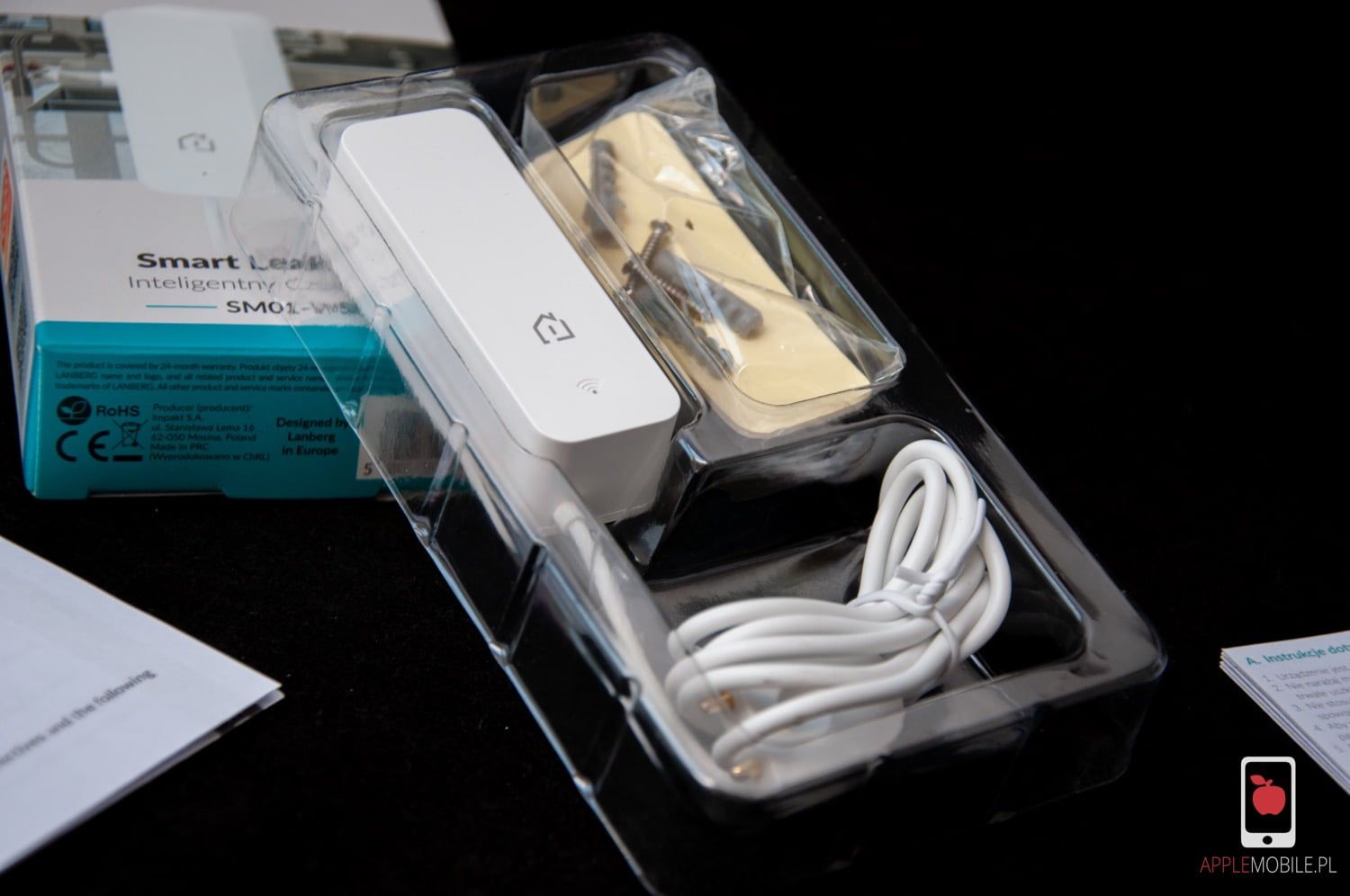 W niewielkich rozmiarów opakowaniu producent załączył czujnik, a także elementy montażowe – dociętą taśmę dwustronną pozwalającą zamocować elektronikę na ścianie oraz sondę przy podłodze.