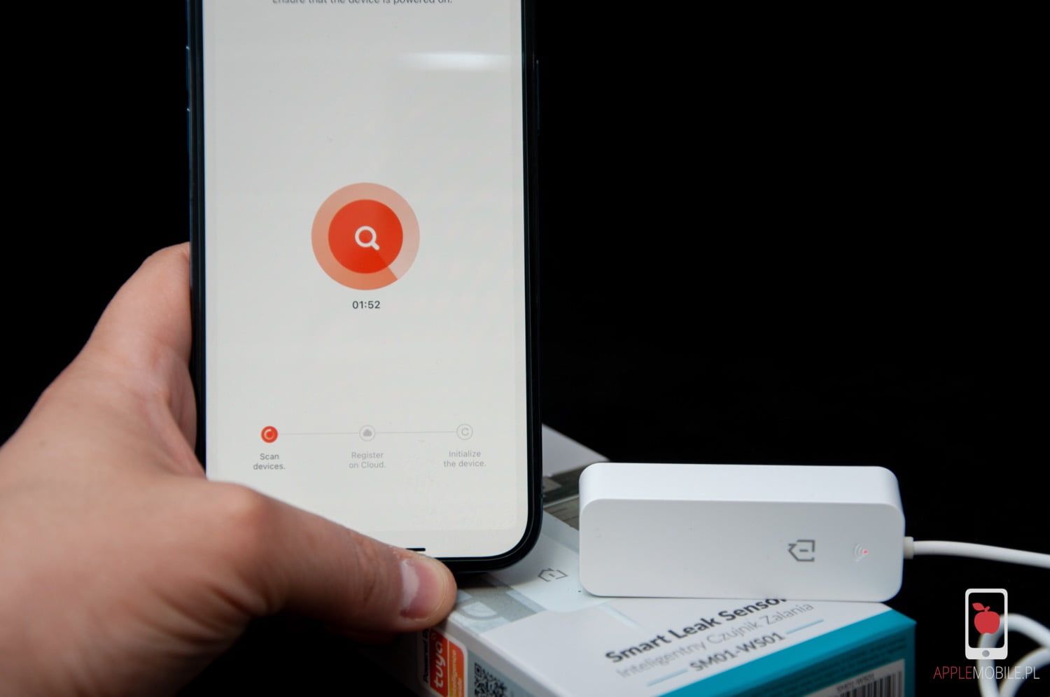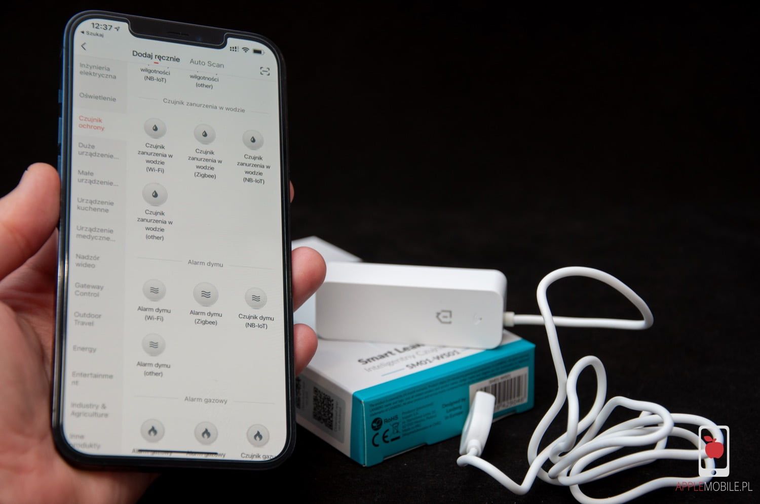 Dodanie urządzenia do systemu jest dziecinnie proste. Wystarczy uruchomić aplikację Tuya, wybrać „+” w prawym górnym rogu, a następnie z belki kategorii urządzeń po lewej stuknąć w Czujnik ochrony. Następnie z listy urządzeń wybrać Czujnik zanurzenia w wodzie (Wi-Fi). Podajemy hasło do naszej sieci WiFi i czekamy na połączenie z urządzeniem. Od tej chwili czujnik będzie gotowy do pracy.