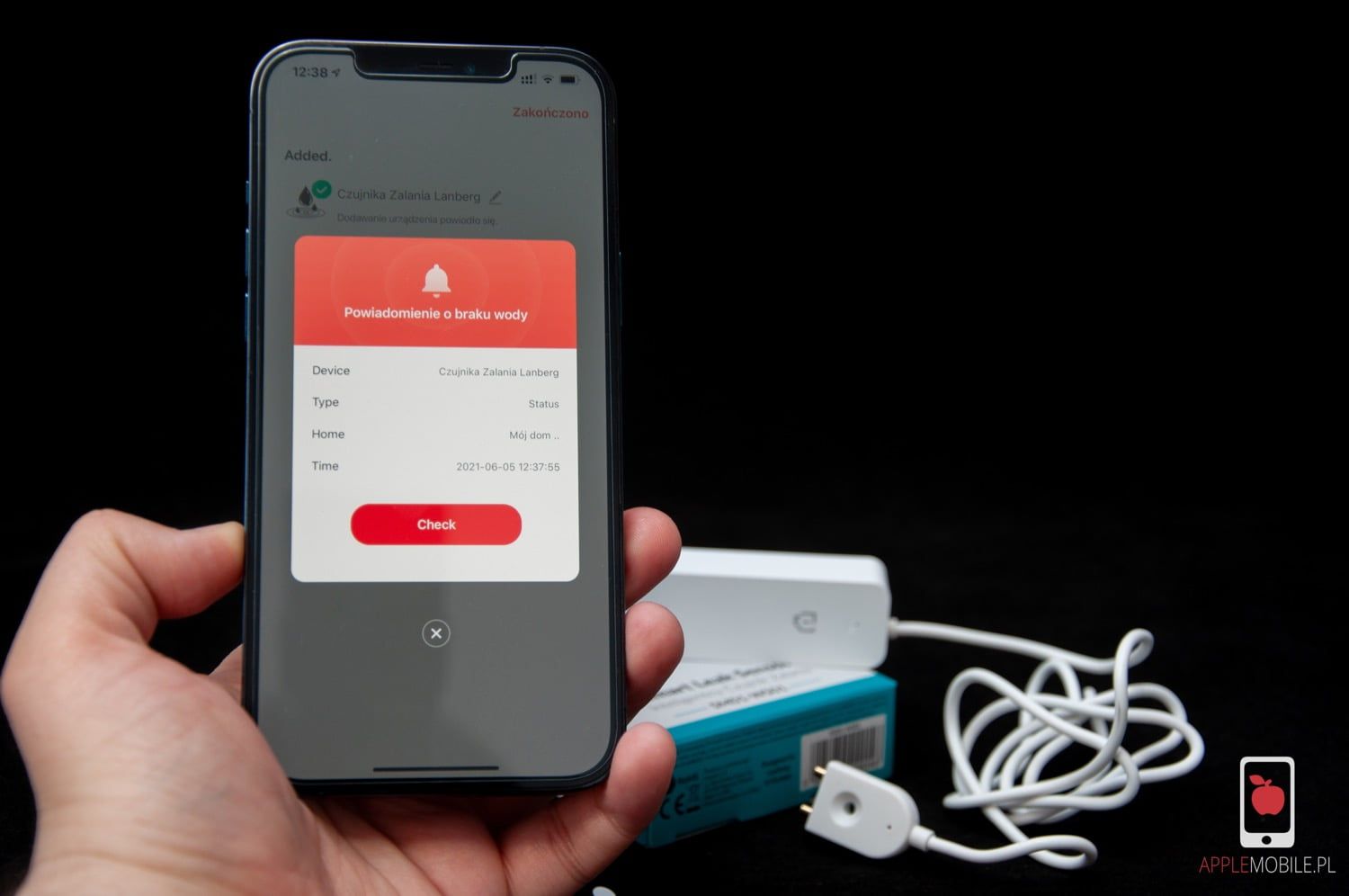 Podczas testu na sucho sprawdziłem, że informacja o zalaniu pojawia się niemal natychmiast od chwili, gdy zamoknie sonda. Opóźnienie trwa jakieś 1-2 sekundy od zanurzenia sondy do pojawienia się powiadomienia na telefonie. Działa to więc bardzo szybko, pomimo zasilania bateryjnego i łączności po WiFi.