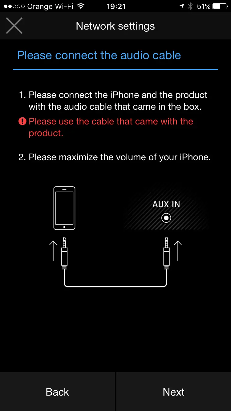 ONKYO NCP-302 z siecią WiFi okaże się, że równie niezbędny stanie się wspominany jako coś niespotykanego przewód JACK-JACK. Podczas podpinania głośnika do domowej sieci aplikacja wymusza na nas podłączenie smartfonu za pomocą tego kabla. W innym wypadku nie uda nam się nawiązać połączenia z BEZPRZEWODOWĄ siecią domową. Nie muszę dodawać, że użytkownikom iPhone’a 7 bez wbudowanego portu JACK nieco komplikuje to życie?