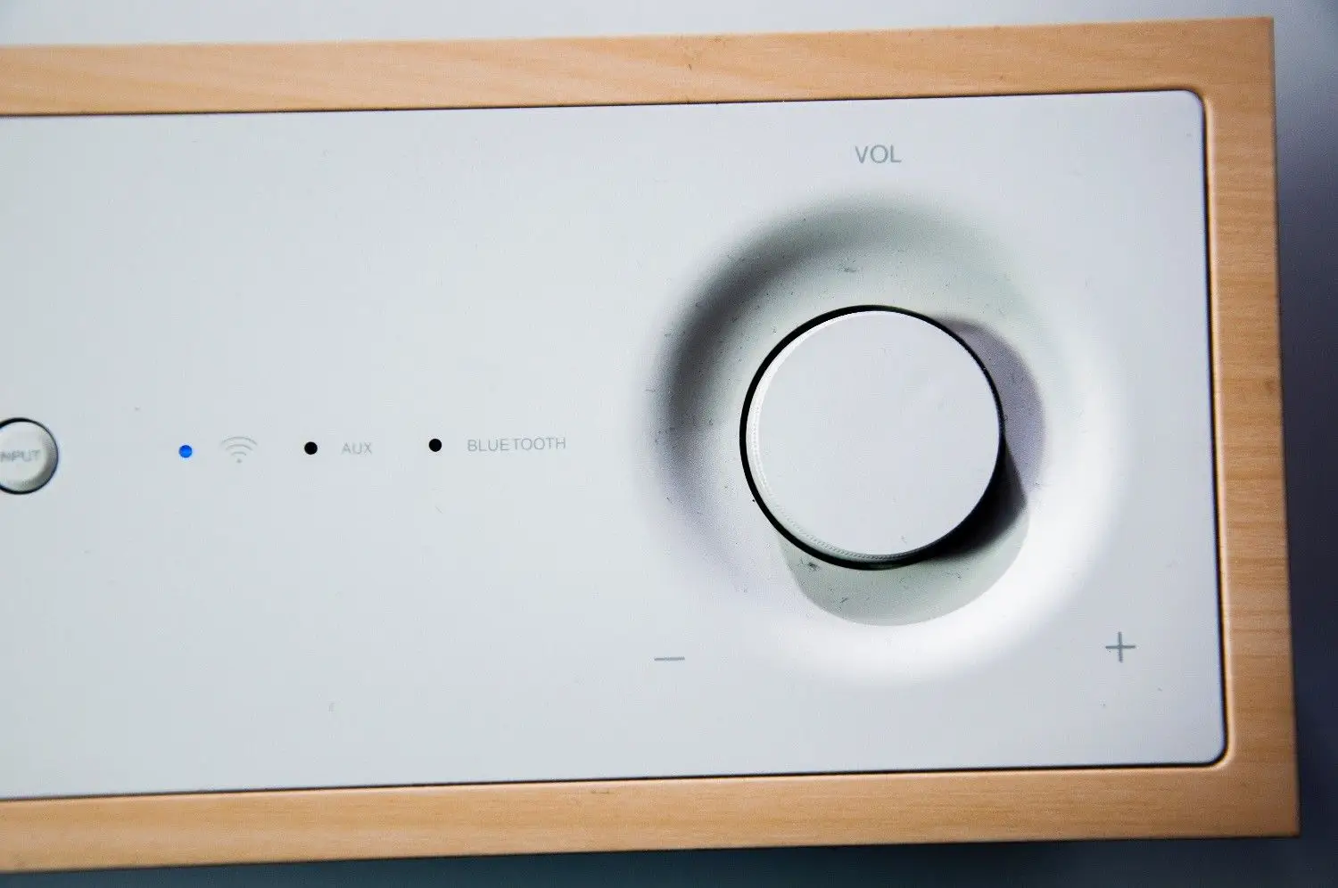 Pomiędzy przyciskami, a potencjometrem do regulacji poziomu głośności producent zainstalował diody LED informujące o typie podłączonego źródła dźwięku. Jak na nowoczesne urządzenie przystało, źródłem może tu być urządzenie komunikację się w technologii Bluetooth, ale także te wykorzystujące bezprzewodową sieć WiFi w ramach protokołu AirPlay lub Google Play.