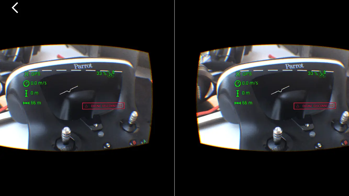 W tym momencie obraz na naszym smartfonie dzieli się na pół, dla każdego oka z osobna. Na obrazie z tego co rejestruje kamera naniesione są podstawowe informacje dotyczące stanu naładowania baterii w quattrocopterze, baterii w kontrolerze, stanu GPS, prędkości lotu, jego odległości czy dystansu. To czego mi brakuje, to stanu naładowania baterii smartfonu oraz zasięgu kontroler-dron.