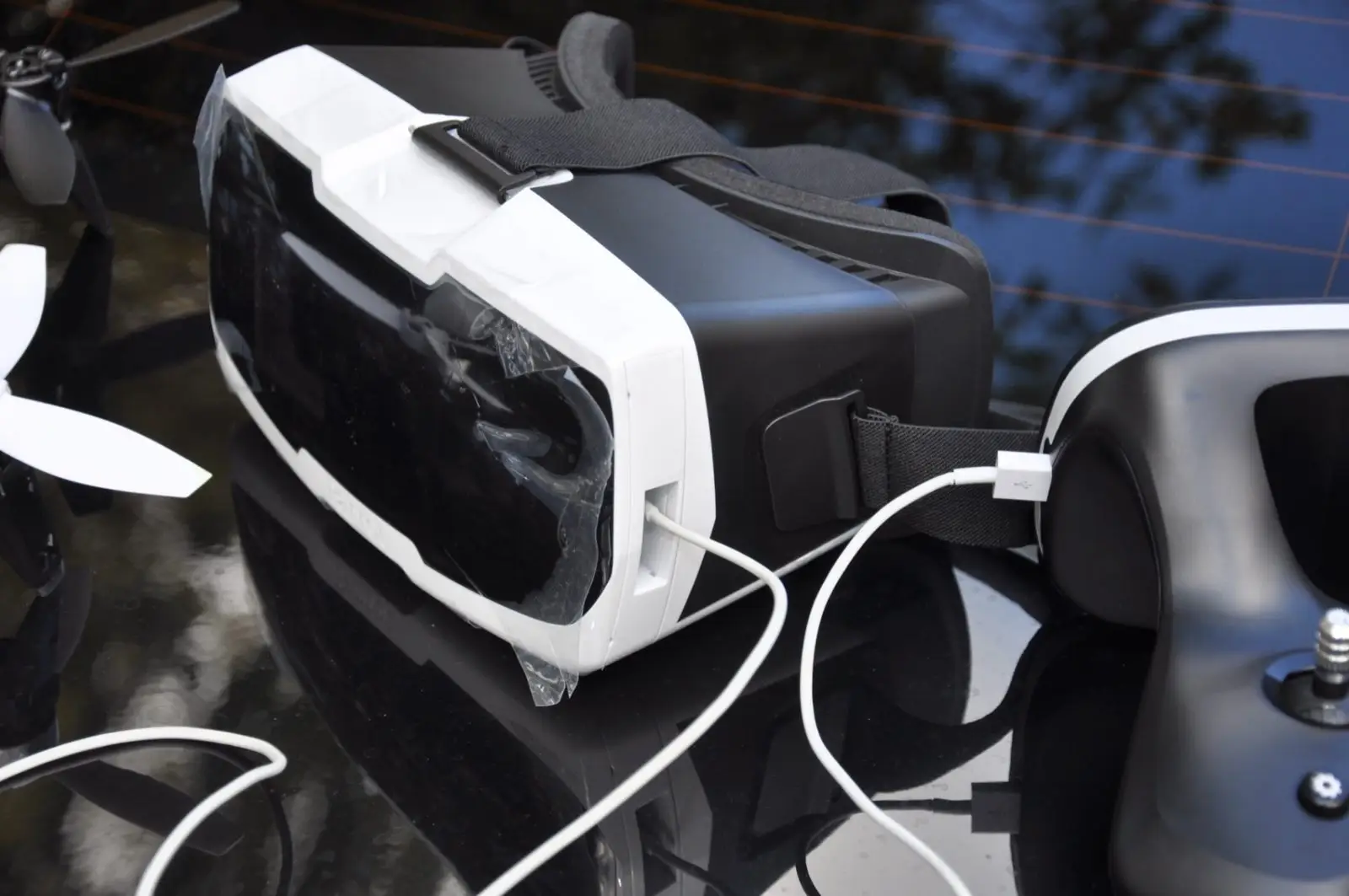 Kolejnym bardzo ważnym elementem zestawu są gogle FPV. Działają na zasadzie analogicznej do gogli cardboard. Są wyposażone w dwie soczewki, ekranem jest nasz smartfon, a jego instalacja jest możliwa za sprawą specjalnej tacki, wysuwanej z gogli.
