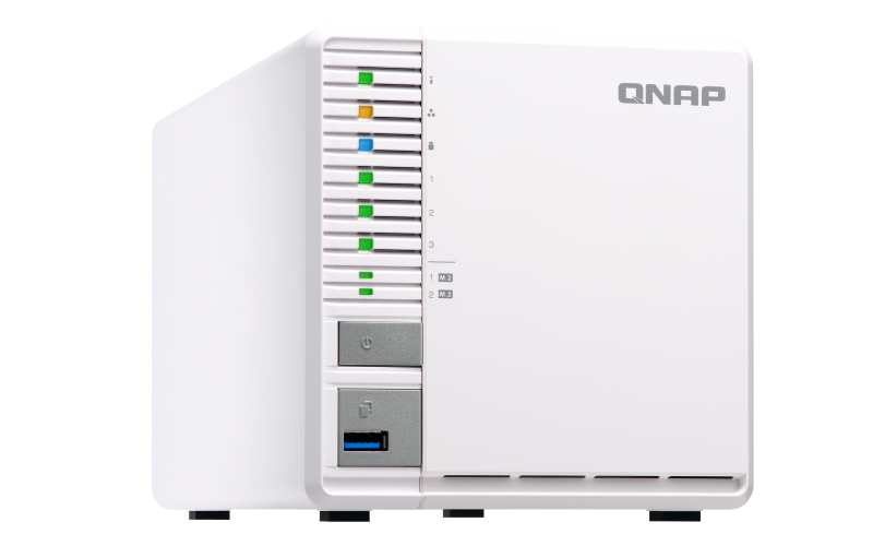 Wyposażono go w procesor Intel Celeron J1800 (2 rdzenie, 2.41 GHz do 2.58 GHz), 2 GB pamięci RAM, którą można rozszerzyć. Kieszeni na dyski 3,5″ są trzy. Jeśli ktoś chciałby uzyskać szybsze transfery, to wewnątrz ulokowano złącza M.2 – sztuk dwa. Dodatkowo na obudowie znalazły się następujące porty – USB 3.0 – 1 szt, USB 2.0 – 2 szt, RJ-45 10/100/1000 (LAN) – 1 szt, DC-in (wejście zasilania) – 1 szt, HDMI-out – 1 szt, Wyjście Audio (minijack 3,5 mm) – 1 szt.