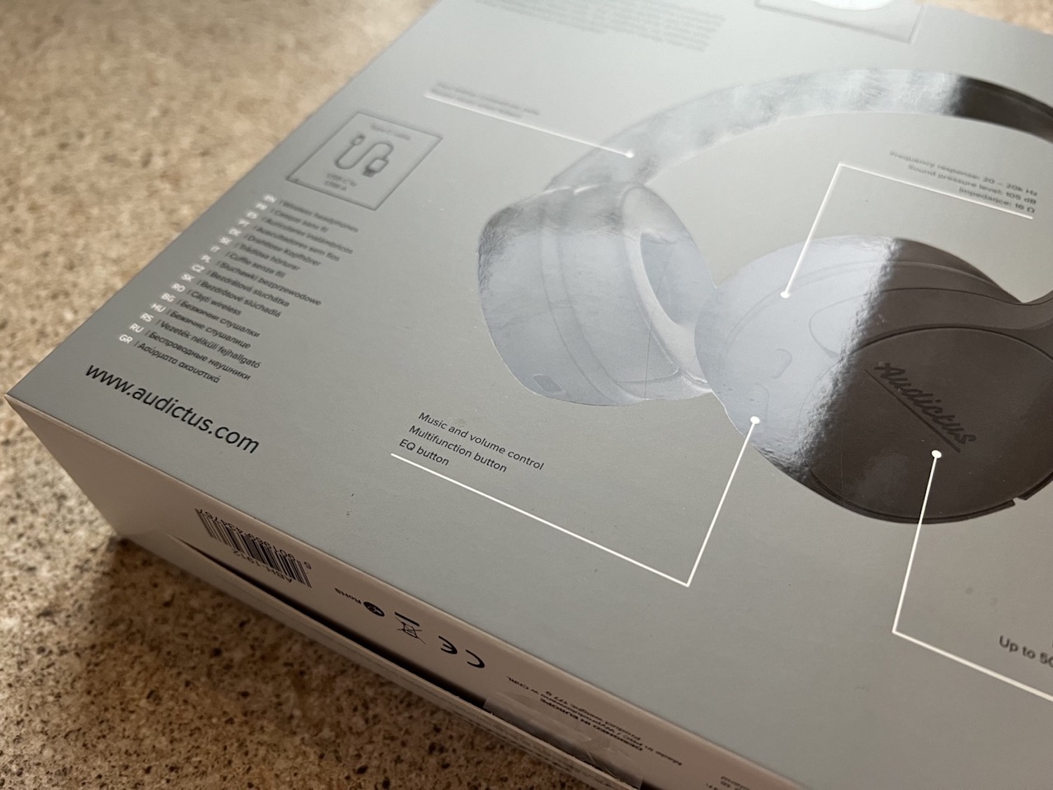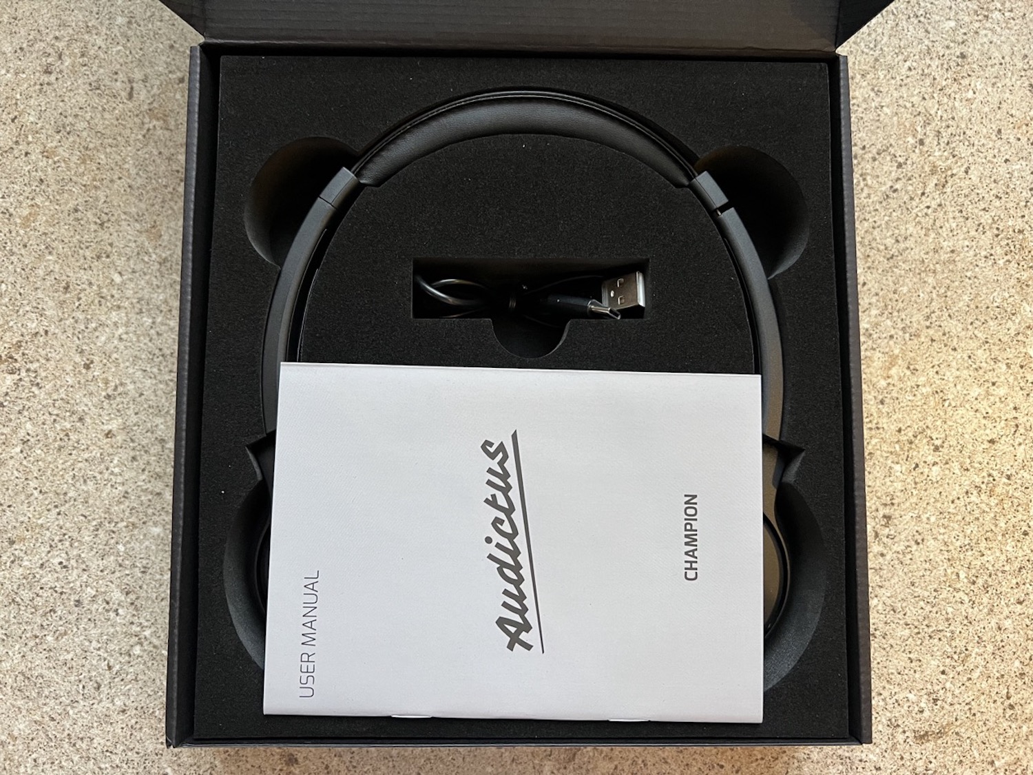 Na przodzie pudełka możemy znaleźć głównie prezentację wizualną słuchawek. Natomiast na jego odwrocie ukazuje się nam ich krótka specyfikacja wraz z opisem. Wewnątrz szarego opakowania znajduje się dodatkowe, czarne pudełko ochronne, w którym starannie umieszone są słuchawki AUDICTUS Champion wraz z krótkim kabelkiem do ładowania i instrukcją obsługi urządzenia.