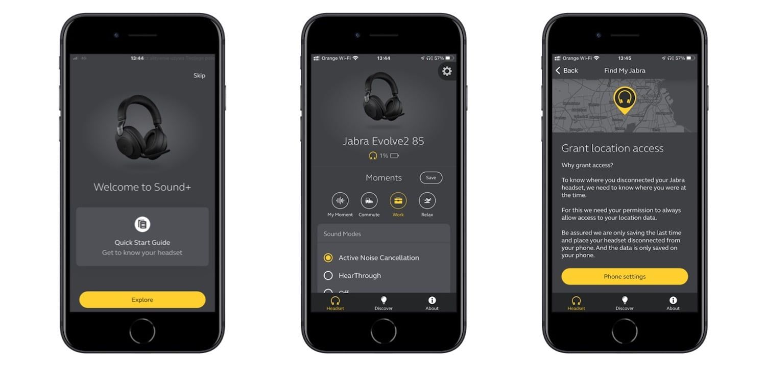 W sklepach z aplikacjami dostępna jest do pobrania za darmo aplikacja Jabra Sound+. Dzięki niej można skonfigurować słuchawki, zaktualizować oprogramowania czy sprawdzać stan naładowania akumulatora. W aplikacji dostępny jest także korektor z kilkoma predefiniowanymi profilami. Można też stworzyć własne profile dźwiękowe. Przy pomocy aplikacji można także uruchomić tak zwany pejzaż dźwiękowy, czy dźwięki, które pomogą w skupieniu lub izolacji od otoczenia. Funkcja Find my Jabra, pomaga zlokalizować miejsce, w którym ostatnio korzystaliśmy ze słuchawek. Usługa nie jest tak funkcjonalna jak Find my od Apple, nie mniej pozwoli się z grubsza zorientować, gdzie pozostawiliśmy słuchawki .