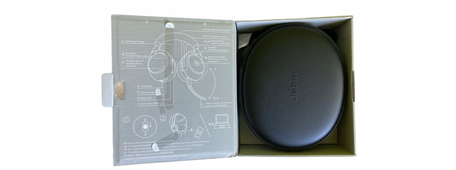 W twardym i wytrzymałym futerale znajdują się słuchawki oraz akcesoria w postaci: klucza sprzętowego, kabla USB-C, kabla audio 3,5 mm do 3,5 mm oraz adaptera do słuchawek lotniczych. Klucz sprzętowy jest niezbędny do rozszerzonej współpracy słuchawek Jabra Evolve2 85 z Microsoft Teams. Każde akcesorium ma w futerale swoje miejsce, więc przy likwidowaniu stanowiska pracy łatwo sprawdzić, że czy zabraliśmy wszystko, a żaden z elementów nie został na biurku.