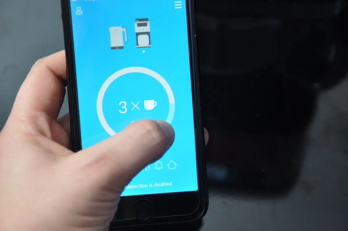 Kawa może być także parzona w chwili, gdy zostaniemy wykryci po GPS, ze wracamy do domu na przykład z pracy. Tu podobnie – możemy albo otrzymać powiadomienie z możliwością uruchomienia parzenia lub ustawić aplikację tak, aby parzyła kawę zawsze kiedy wracamy z pracy. Bardzo praktyczna jest funkcja skalowania naszej filiżanki. W końcu filiżanki są różne. Druga sprawa, że niektórzy wolą przelicznik w „kubkach” niż filiżankach. Aplikacja pozwala dobrać odpowiednią ilość przygotowanego naparu do wielkości naszej zastawy. Przy fabrycznych ustawieniach 3 filiżanki to 1 kubek.