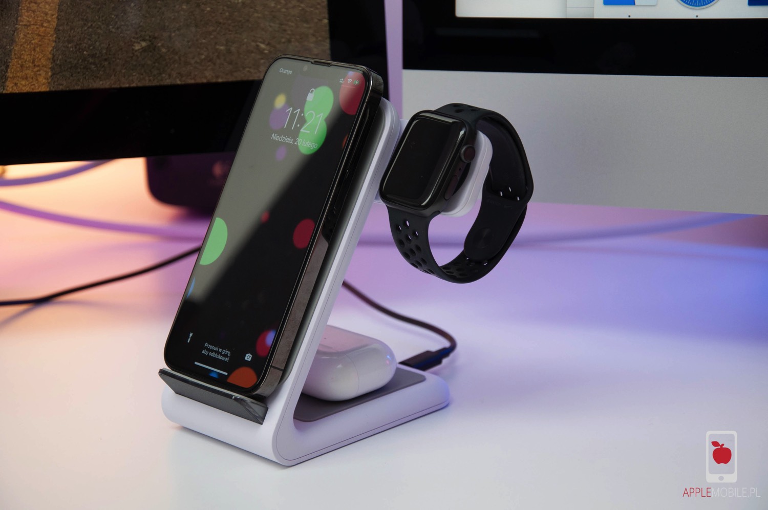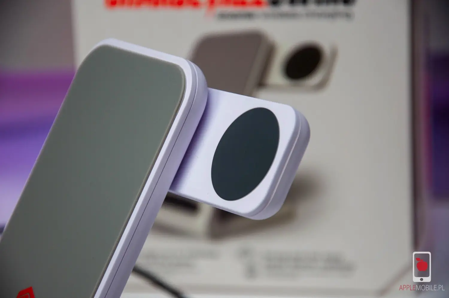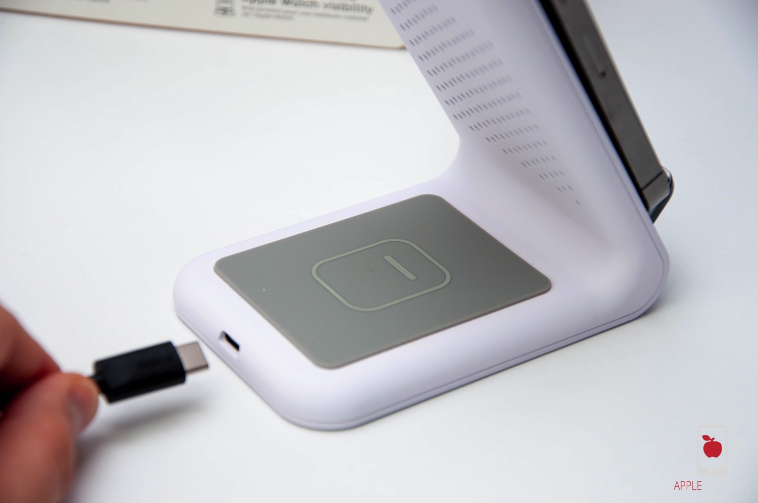 Jako że nie mamy tutaj MagSafe, telefon ustawiamy na „schodku”, który lekko się podświetla białym światłem. Nie wiem jak wy, ale w przypadku korzystanie z urządzenia w sypialni miałbym z tym problem, jeżeli przez cały cykl ładowania ładowarka rozświetlałaby mi pomieszczenie. Całe szczęście producent o tym pomyślał, bo dioda po chwili od odłożenia urządzenia na ładowarkę się wygasza.