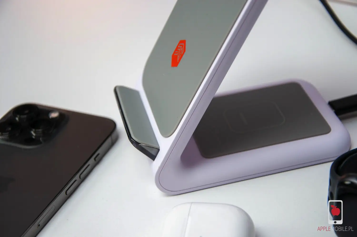 Sprawa jest dużo bardziej skomplikowana w przypadku zegarka. W tym wypadku oferowane jest wyłącznie ładowanie zegarka Apple Watch, który ma własne dedykowane ładowanie indukcyjne. Po prostu zegarka nie naładujecie, kładąc go na przykład w miejscu, gdzie ładujecie słuchawki. Musi mieć dedykowaną swoją płytkę.