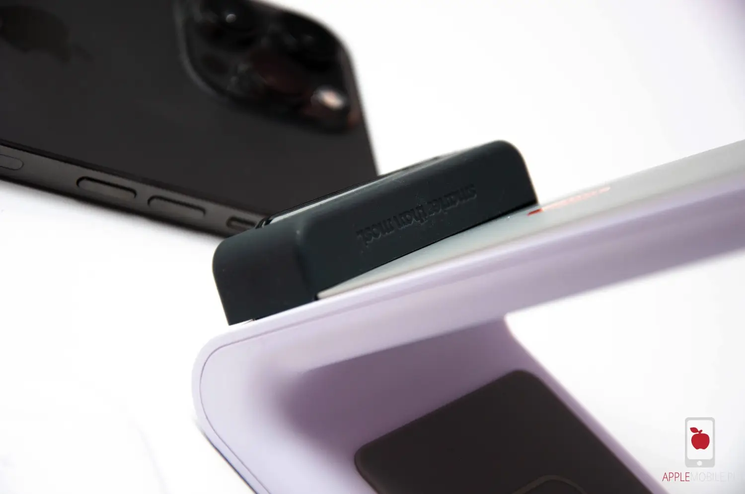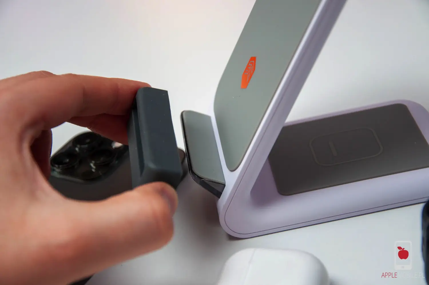 Miejsca, które podtrzymują ładowane na nim urządzenia, są obłożone miękką, antypoślizgową gumową. To dzięki niej leżą na niej stabilnie i trudno, aby się zsunęły, nawet jeżeli jest to iPhone 13 Pro z wielkimi obiektywami aparatów, przez które nie leży na tej ładowarce idealnie płasko.