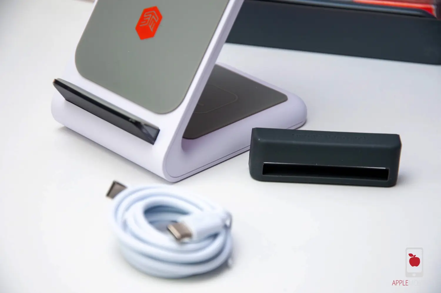 Ładowarka indukcyjna 3 w 1 to najprostszy opis tego urządzenia. W zestawie znajdziemy poza samym urządzeniem biały przewód zasilający typu USB-C oraz dodatkową gumkę na podstawkę, w przypadku, gdyby odstawiany na stojak telefon okazał się tak skonstruowany, że antena indukcyjna zainstalowana w podstawce będzie na innej wysokości, niż ta znajdująca się na odkładanym telefonie. Nie ma zasilacza.