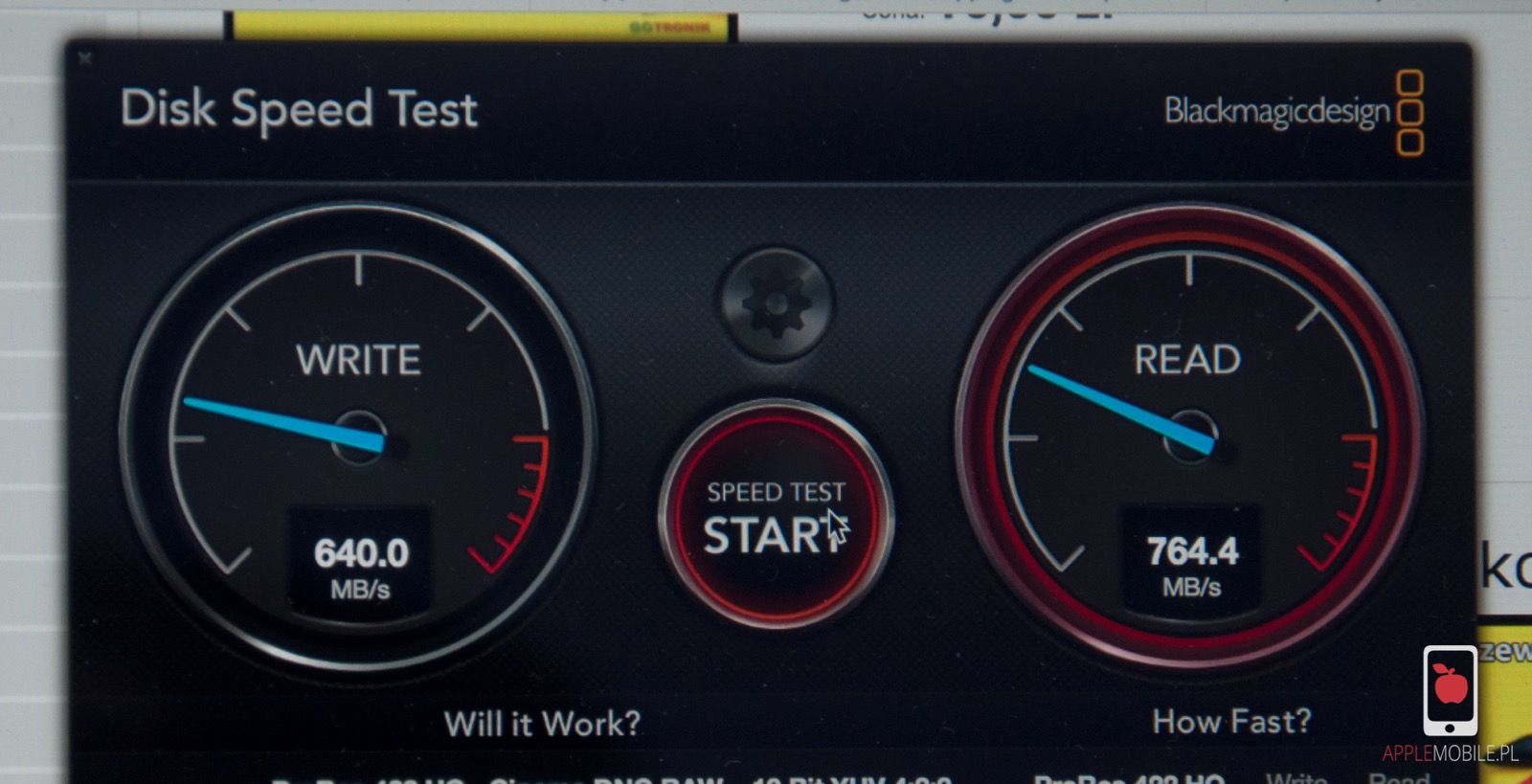 Doskonałych! Po podłączeni dysku przez Thunderbolt do mojego Macbooka Pro Retina z 2015 roku uzyskałem wyśmienite prędkości transferu dla zapisu i odczytu danych. Dysk ten może być więc bardzo dobrym rozwiązaniem dla komputerów o niewielkich systemowych pamięciach dyskowych, na których zapragniemy pracy z materiałem wideo czy grafiką, która wymaga miejsca na projekt z szybką transmisją danych.
