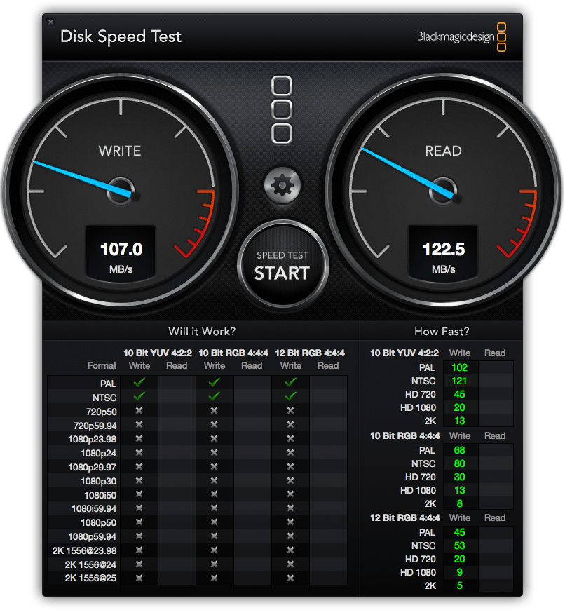 W aplikacji Disk Speed Test uzyskane wartości maksymalne to 107 MB/s przy zapisie oraz 122.5 MB/s przy odczycie. To bardzo obiecujące wartości, które powinny spełnić oczekiwania większości użytkowników.