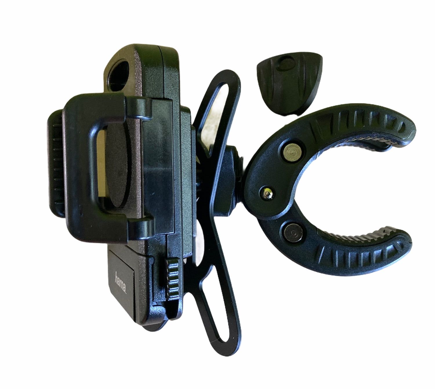 Rowerowy uchwyt Hama w pierwszej chwili można pomylić z typowym uchwytem samochodowym. Ma dwie szczęki, które zaciskamy na smartfonie i otwieraną półeczkę, która dodatkowo stabilizuje telefon. Oczywiście taka ochrona nie jest wystarczająca, dlatego uchwyt dodatkowo wyposażony jest w silikonową siatkę, której krawędzie zaczepia się o rogi telefonu. Dzięki takiemu podwójnemu zabezpieczeniu telefon leży w uchwycie bardzo solidnie.