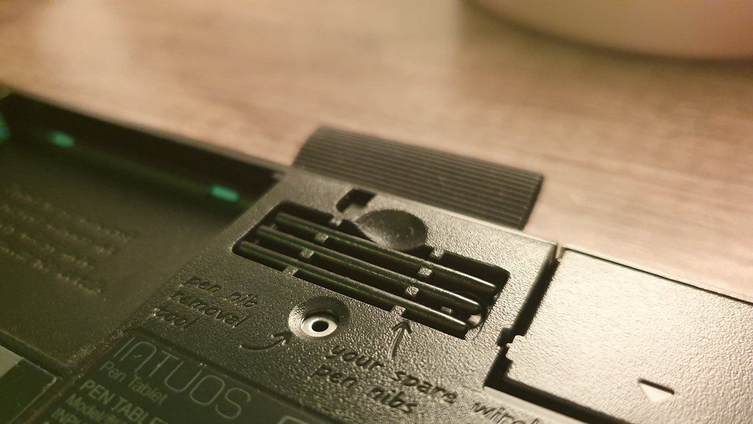 …A na pewno wkłady długopisu. W tabletach innych firm, rysiki często włożone są w środek podstawki pod pena. Jest to okropna rzecz, ponieważ bardzo często się gubią. Twórcy Intuos umieścili je pod klapką. Wyciągnięcie ich z długopisu nie będzie problemem, ponieważ obok znajdziemy mały otwór, który to umożliwi. Poza nimi, występuje tu też miejsce na kabel USB i zabezpieczenie przeciw upadkom.