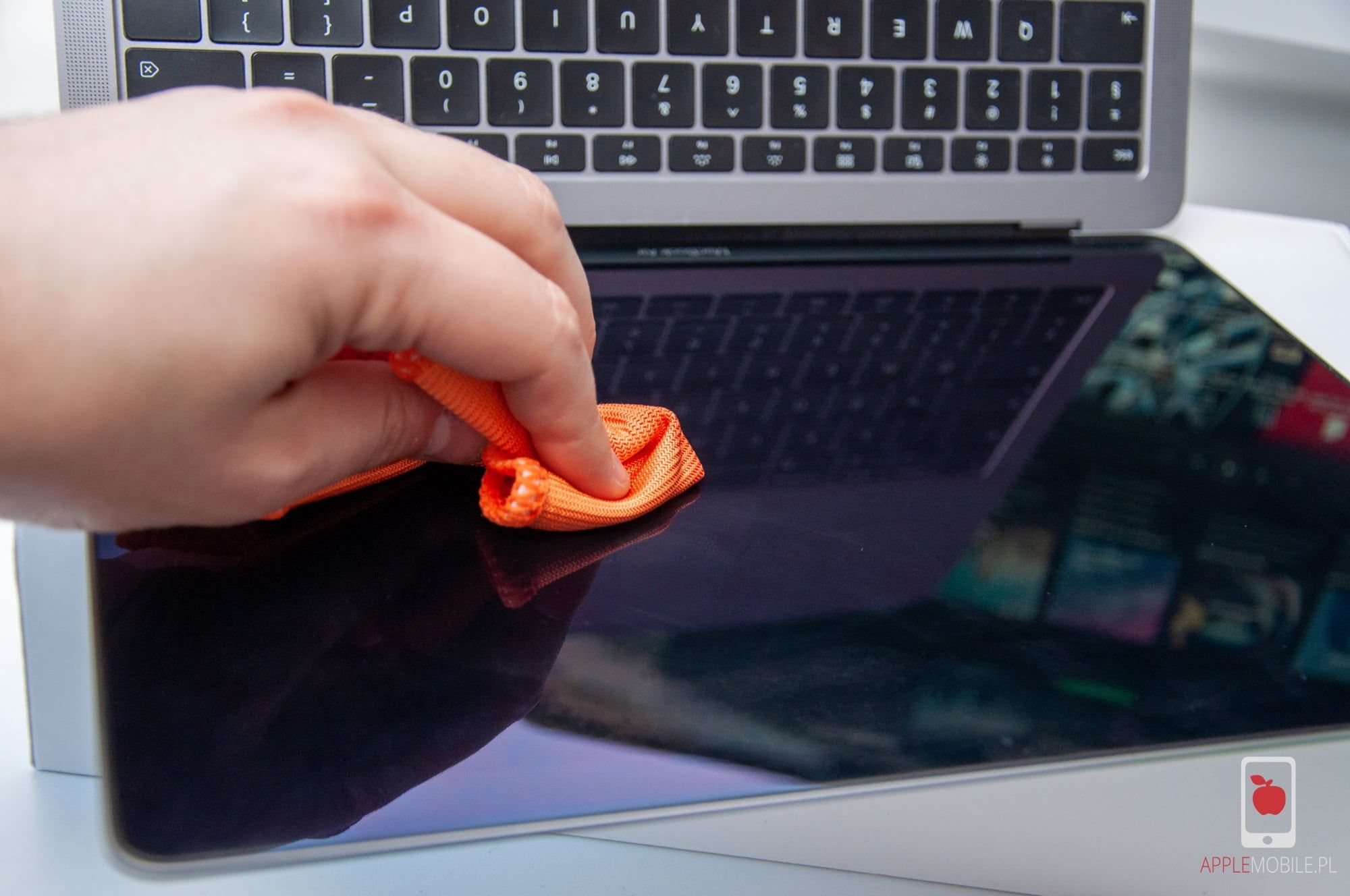 Akurat wpadł mi w ręce mocno wypalcowany ekran Macbooka Air 2019, więc od razu zabrałem się za testy. Dołączona do zestawu ściereczka w dotyku sprawia wrażenie niezwykłej, jakby z czymś wplecionym w nici mikrofibry.
