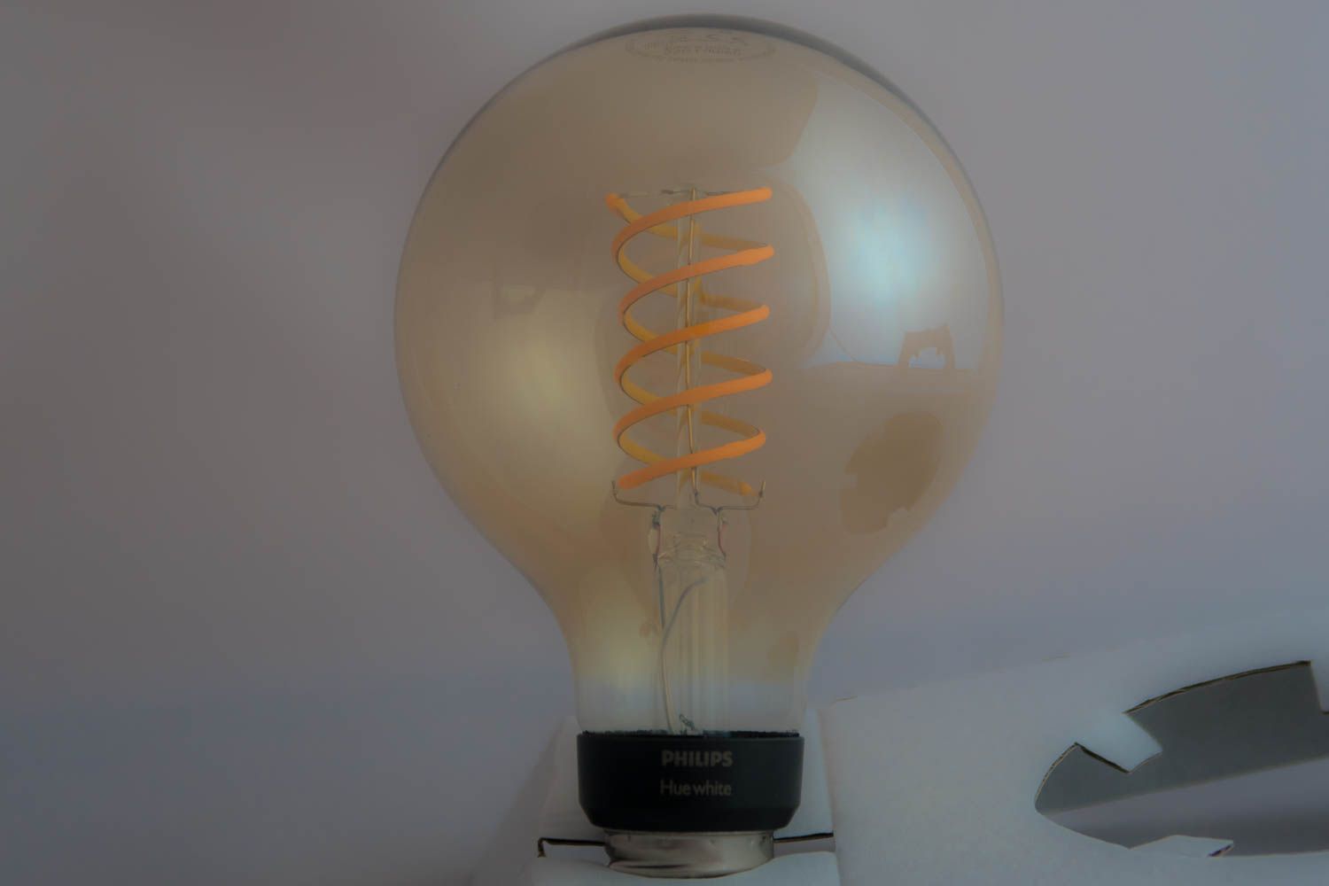 Jako pierwsze zainstalowałem dwie żarówki, co do których miałem największe wątpliwości. Zwykłe, świecące białym świtałem. I można powiedzieć, że polubiłem je od pierwszego spojrzenia. Żarówki Philips Hue White Filament wyglądają klasycznie i bardzo stylowo. Aż żal ukrywać je pod kloszem, więc świetnie sprawdzą się w oprawach, w których żarówka jest na widoku. Element LED ma kształt spirali, co przywodzi na myśl klasyczną żarówkę lub modne ostatnio tzw. żarówki Edisona.