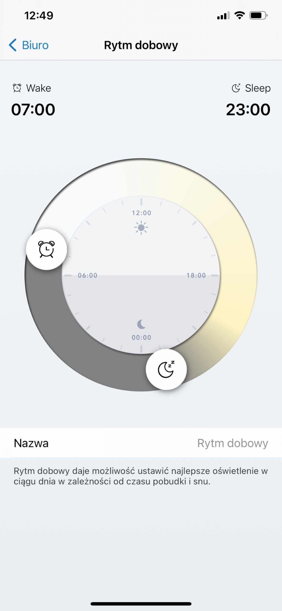 To ostanie, czyli wspomniane chwilę wcześniej „rytmy” chyba najbardziej przypadły mi do gustu z rzeczy, które są wyjątkowe. Owa funkcja to nic innego jak spersonalizowanie naszego dnia, czyli uruchamianie, przygaszanie, ustawianie konkretnych kolorów do konkretnych przedziałów czasowych. Przykładowo jeśli pracujemy w domu od 10-16 to możemy w tym okresie czasowym ustawić odpowiednią dla nas barwę i intensywność światła. Fajna sprawa i przede wszystkim bardzo użyteczna.
