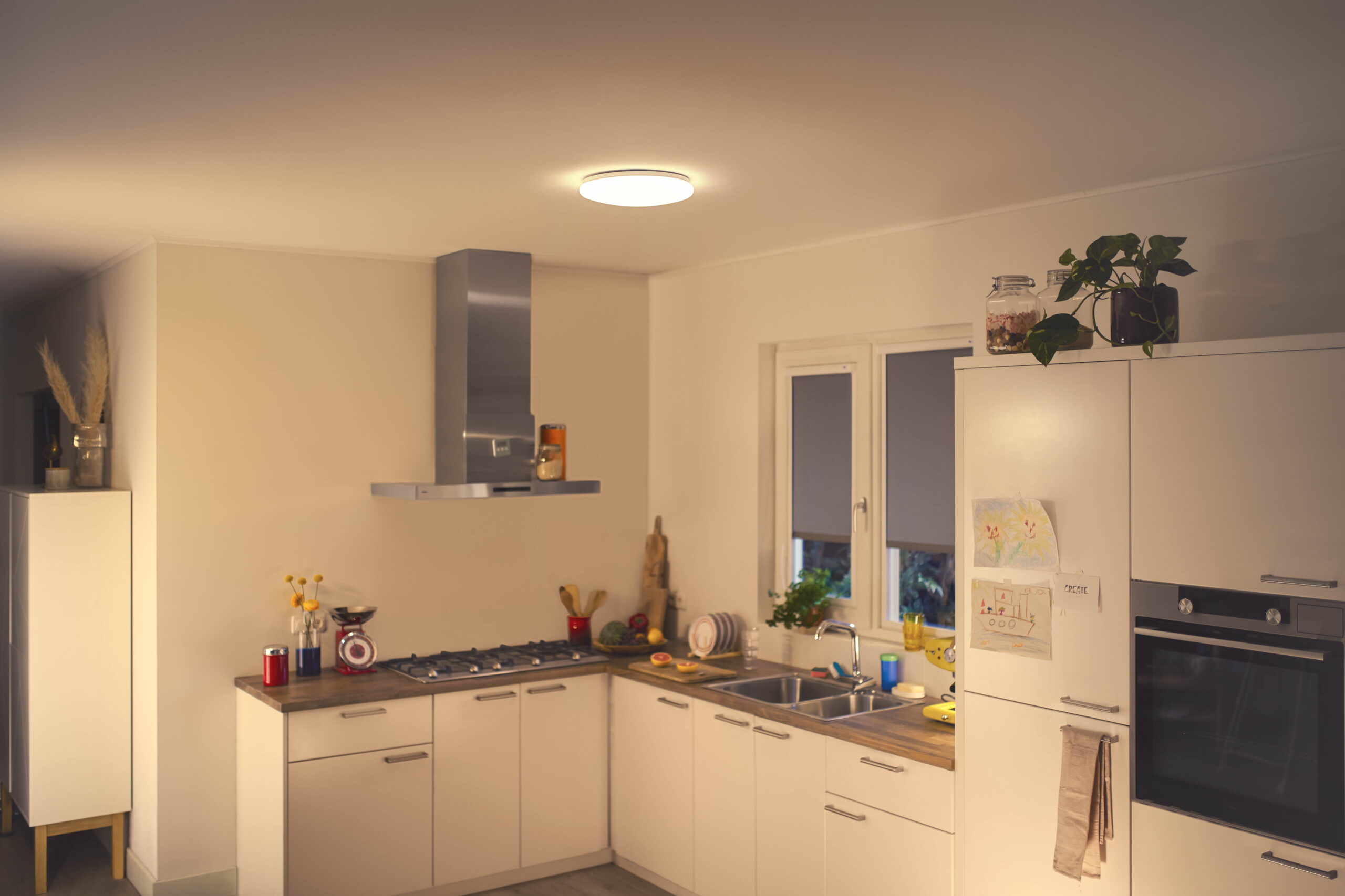 Przyciemniane lampy sufitowe WiZ ADRIA o zimnej i ciepłej barwie świetnie sprawdzą się w bardziej funkcjonalnych obszarach domu, takich jak kuchnia, łazienka lub korytarz. Po połączeniu lampy sufitowej z aplikacją WiZ, można przyciemniać światła za pomocą aplikacji lub sterowania głosowego. Zimne, jasne światło nie musi już rozbudzać domowników podczas nocnej wizyty w kuchni lub łazience – wystarczy przy pomocy asystenta głosowego ustawić ciepłe, przyciemnione światło.