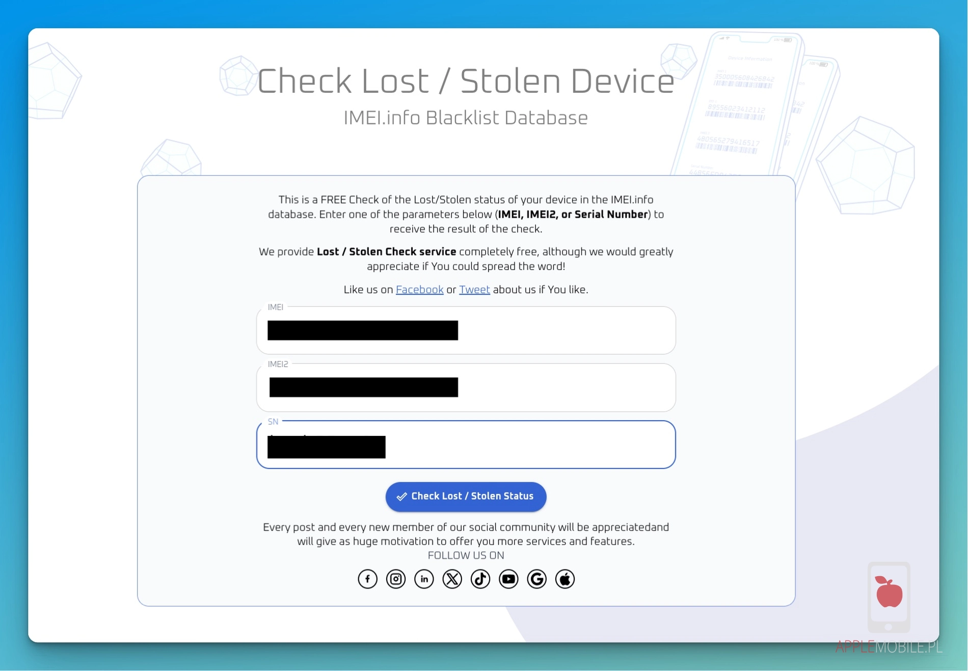 Samo sprawdzenie statusu blokady iCloud może nam nie wystarczyć. W końcu sprzedający może mówić, że narazie używa telefonu, a jak go kupimy to wyloguje go. I nie ma w tym nic dziwnego. Jednak w takim wypadku warto sprawdzić czy czasem jednak nie chce nas oszukać i telefon jest zgłoszony jako skradziony/utracony. Można to sprawdzić za darmo.
