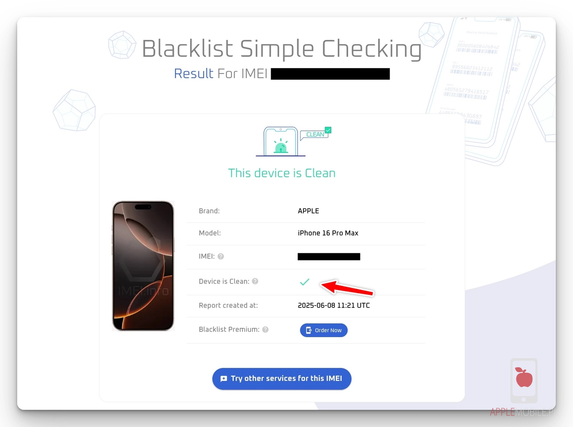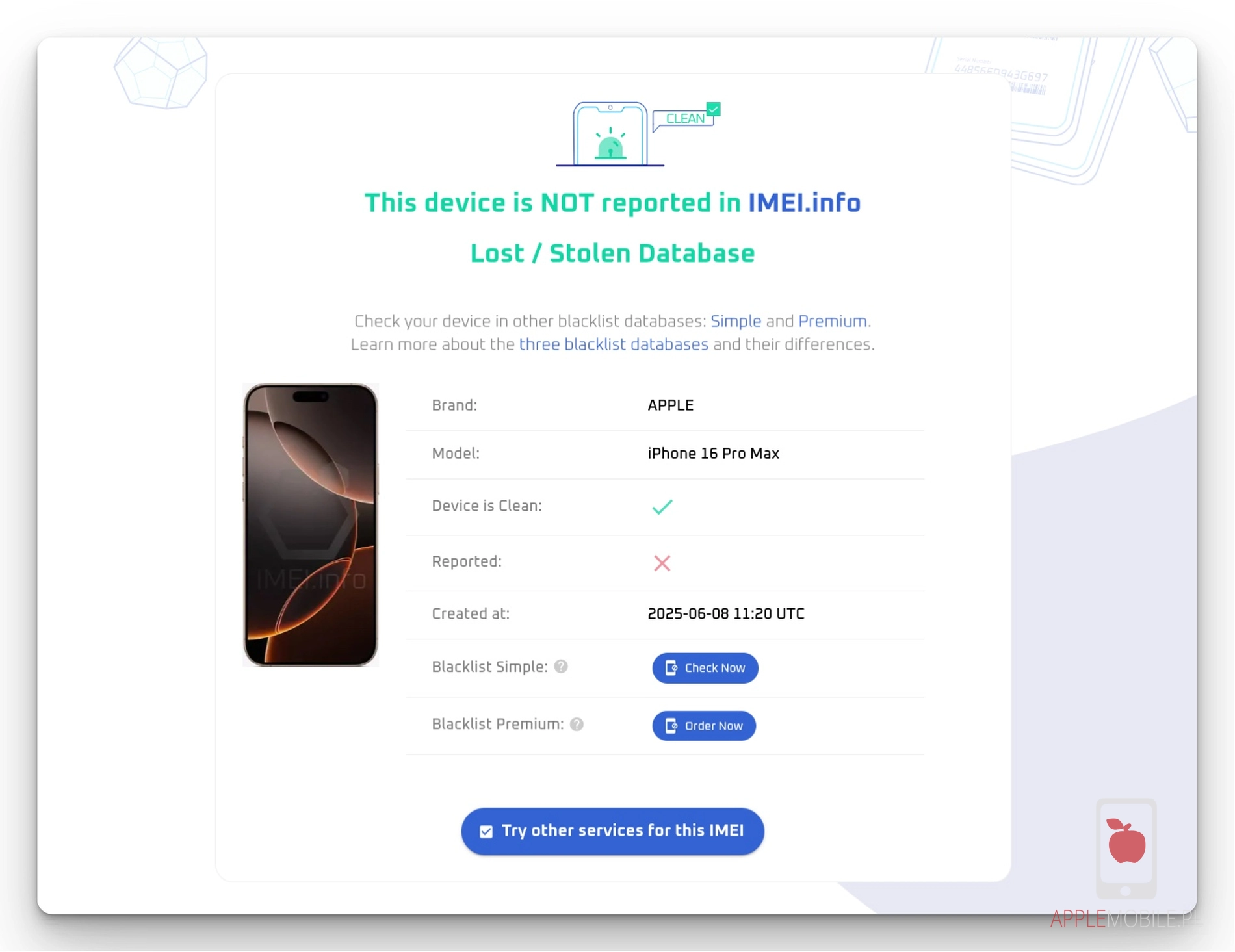 Wynik poinformuje Cię czy iPhone jest zgłoszony jako LOST/Stolen co oznacza, że został skradziony/zgubiony czy jako CLEAN, czyli że ma czysty status.