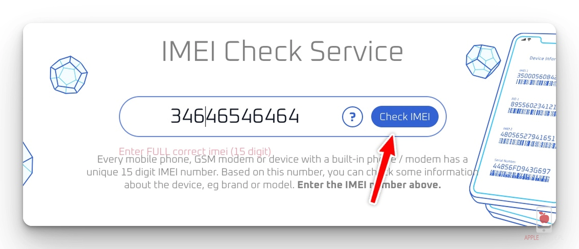 Wpisujemy numer IMEI naszego telefonu i wciskamy Check IMEI. Sprawdź nasz poradnik gdzie znaleźć numer IMEI iPhone, jeżeli nie wiesz gdzie znajduje się ten numer.