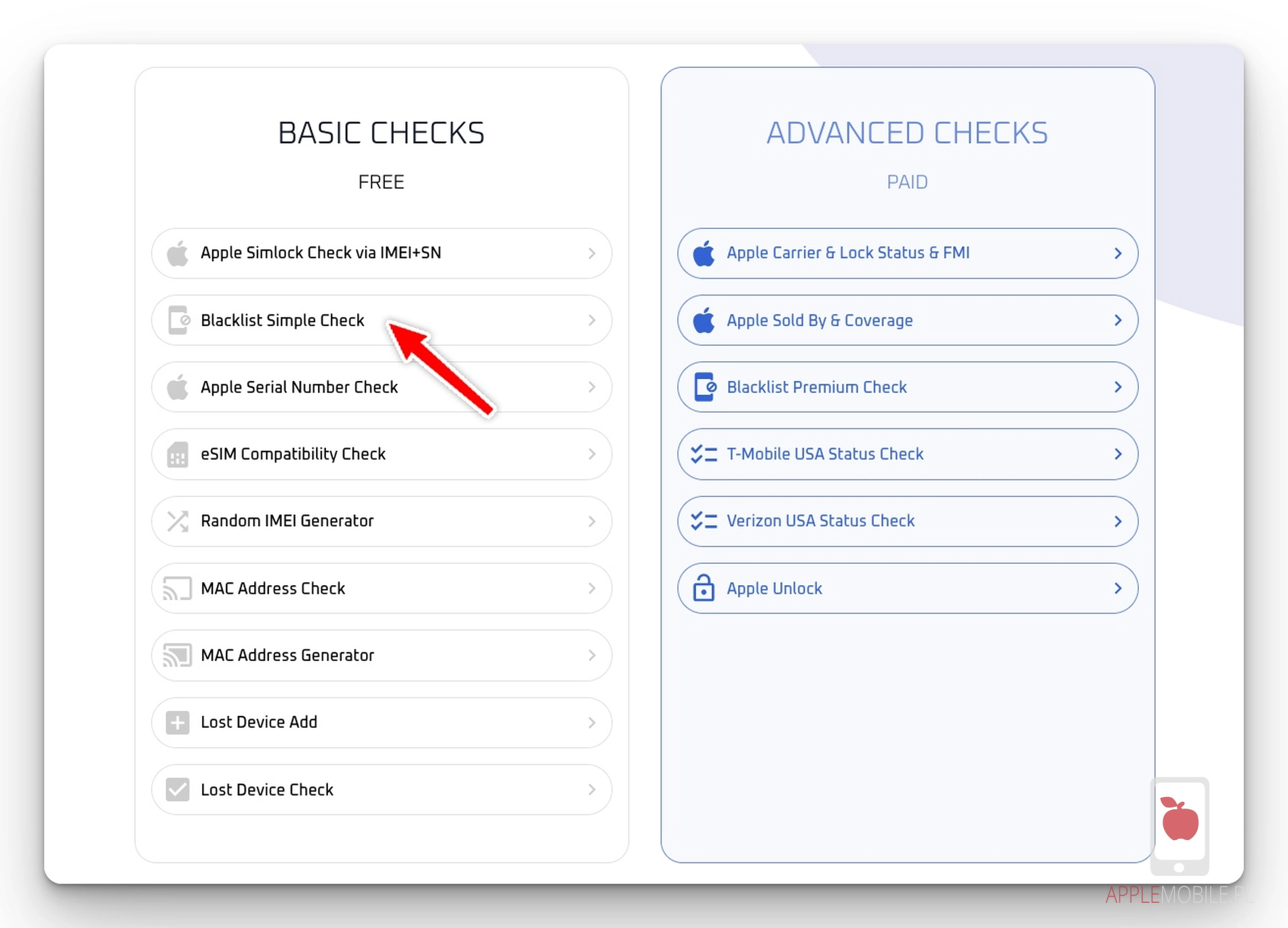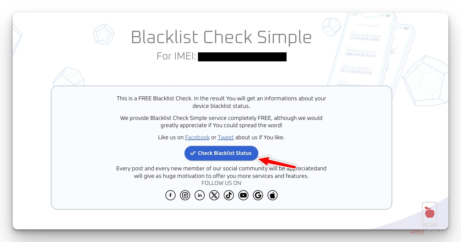 Sprawdzenie statusu iPhone’a na czarnej liście także sprawdzicie na stronie imei.info, jednak w sekcji BASIC CHECKS wybieramy Blacklist Simple Check.