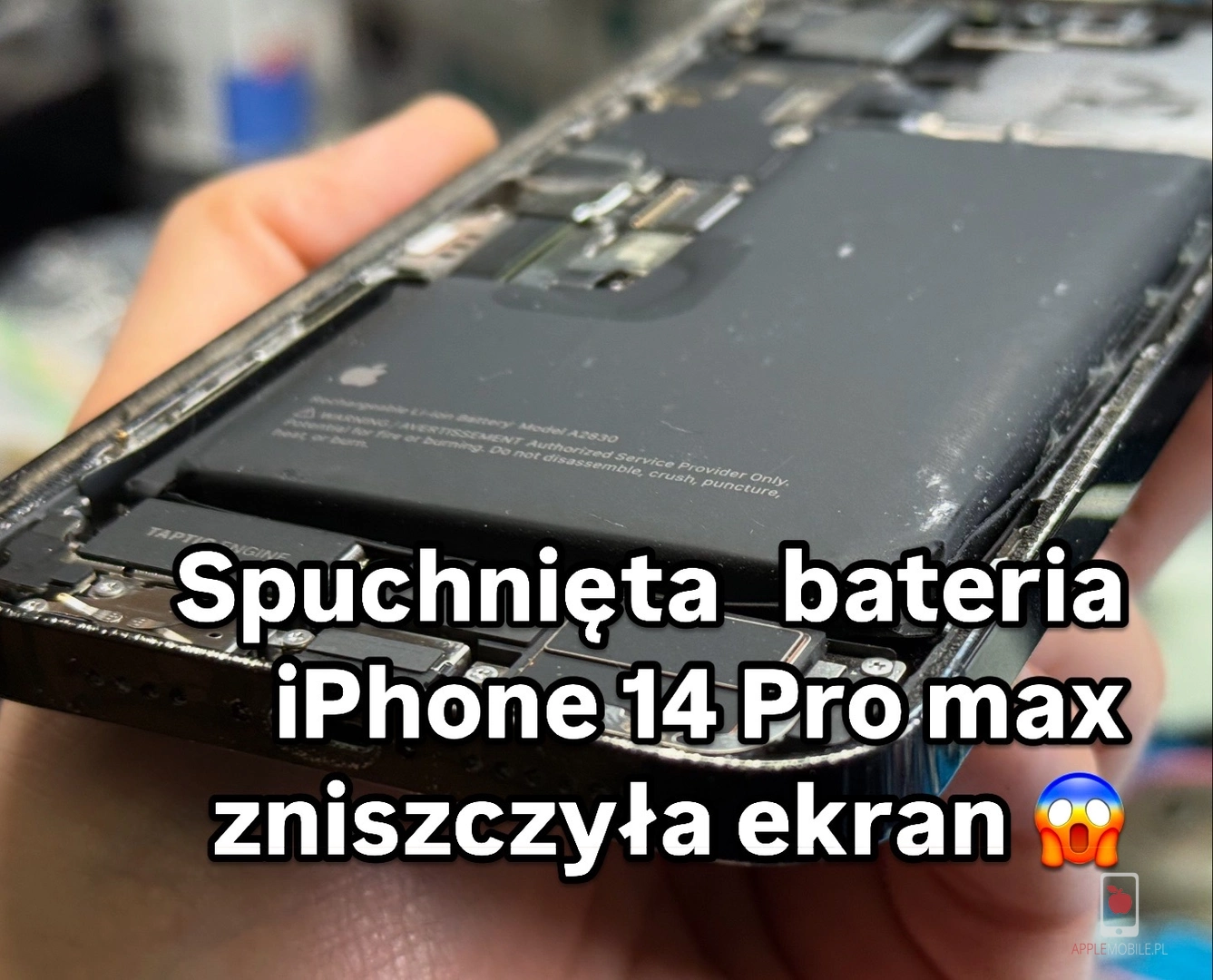 telefon iPhone 14 Pro Max z baterią spuchnięta tak mocno że wypchnęła ekran i zerwała taśmę systemową