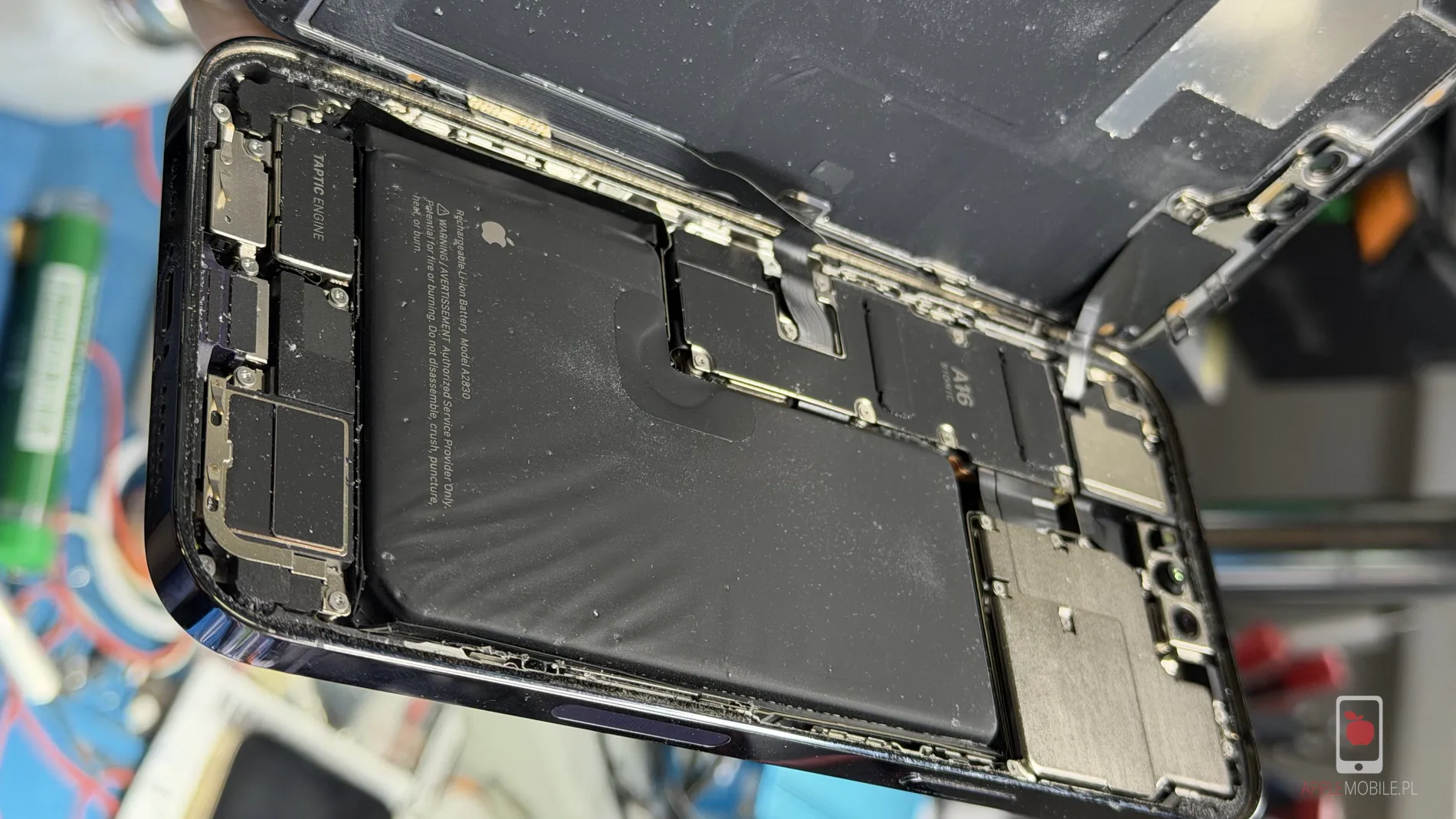 Ten iPhone 14 Pro Max zbyt późno trafił do serwisu na wymianę baterii. Właściciel zwlekał z jej wymianą mimo statusu SERWIS w kondycji baterii, aż ta nagle napuchła zrywając taśmę systemową wyświetlacza. Teraz trzeba wymienić nie tylko zużyta baterię, ale również wyświetlacz czego można było uniknąć.