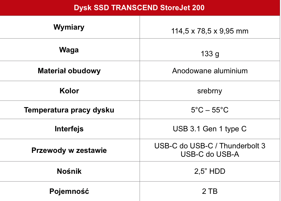Format dysku to 2,5”, a waga to jedyne 133 g. Pomimo niewielkich gabarytów nośnik zapewnia przestrzeń na 2 TB danych. Dysk jest przygotowany do pracy z komputerami Mac bezpośrednio po wyjęciu z pudełka, za sprawą fabrycznego sformatowania w systemie HFS+. Ponadto StoreJet 200 wspiera Time Machine.