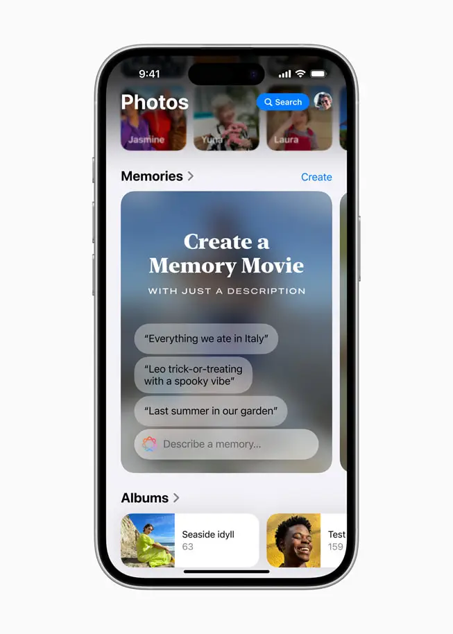Użytkownicy mogą generować filmy za pomocą funkcji Wspomnienia. Wystarczy, że wpiszą opis tego, co chcą otrzymać1. Na podstawie analizy języka i obrazu system Apple Intelligence wybierze najbardziej pasujące do opisu zdjęcia i wideo, opracuje fabułę z rozdziałami opartymi na motywach wykrytych w fotografiach i połączy je w film o spójnej akcji.