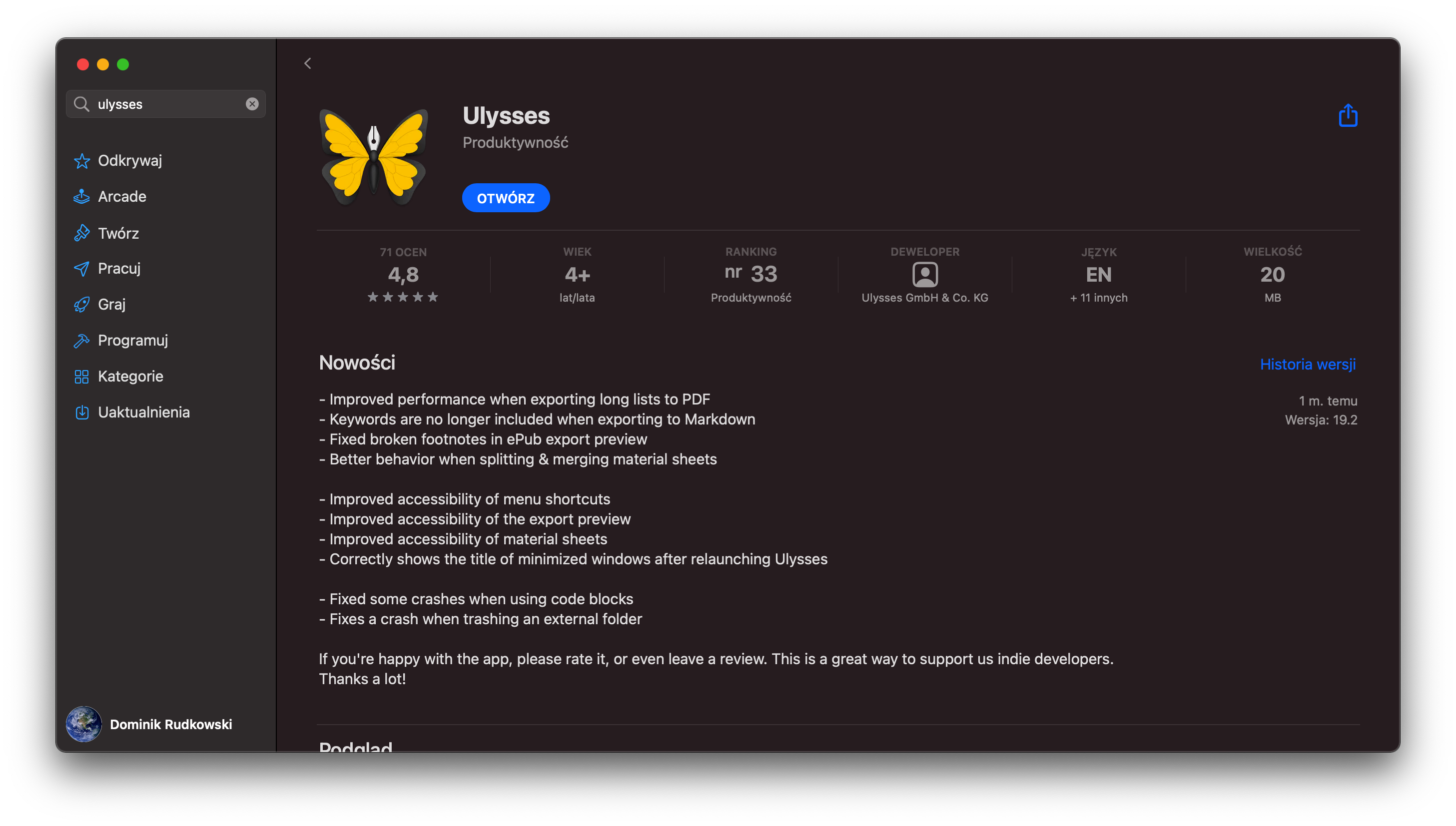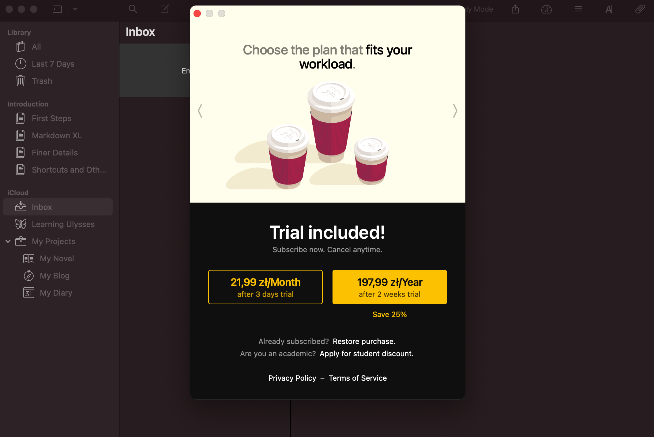Jak najbardziej! Aplikacja jest bardzo prosta i intuicyjna. Korzystanie z niej to czysta przyjemność. Powiem więcej – ostatnimi czasy duża część moich artykułów powstaje właśnie w Ulysses. Zdziwieni? Ja na początku też byłem nieco sceptycznie nastawiony do notatnika za który trzeba zapłacić, ale okazało się z czasem, że jest to warte swojej ceny – która jak widzicie na zrzutach poniżej… do najmniejszych nie należy.
