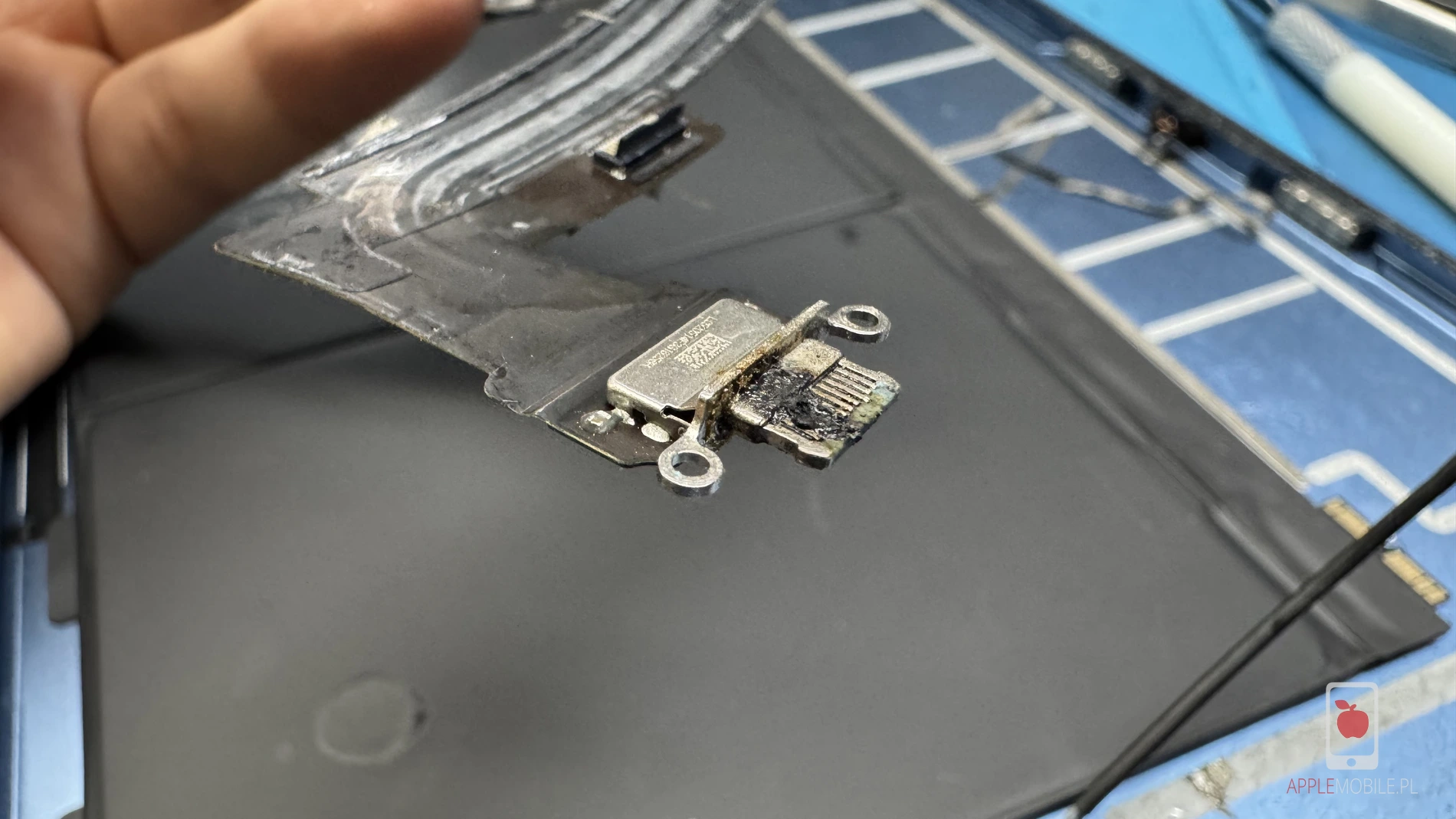 Złącze ładowania jest zainstalowane na foliowej taśmie flex i przylutowane do płyty głównej. Wymiana złącza wymaga rozebrania tabletu, wyjęcia płyty głównej, wymiany złącza ładowania iPad, a następnie złożenia urządzenia, sklejenia go i oczyszczenia z zanieczyszczeń poserwisowych.