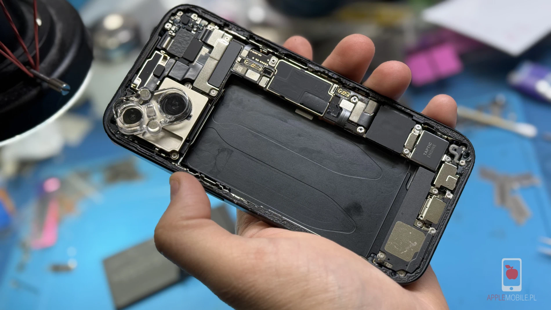 Proces wymiany baterii w iPhone 15 w serwisie APPLEMOBILE zaczyna się od bezpłatnej diagnostyki urządzenia. Technicy sprawdzają stan telefonu, aby upewnić się, że problem rzeczywiście leży po stronie baterii. Następnie przystępują do demontażu obudowy i odłączenia starej baterii.