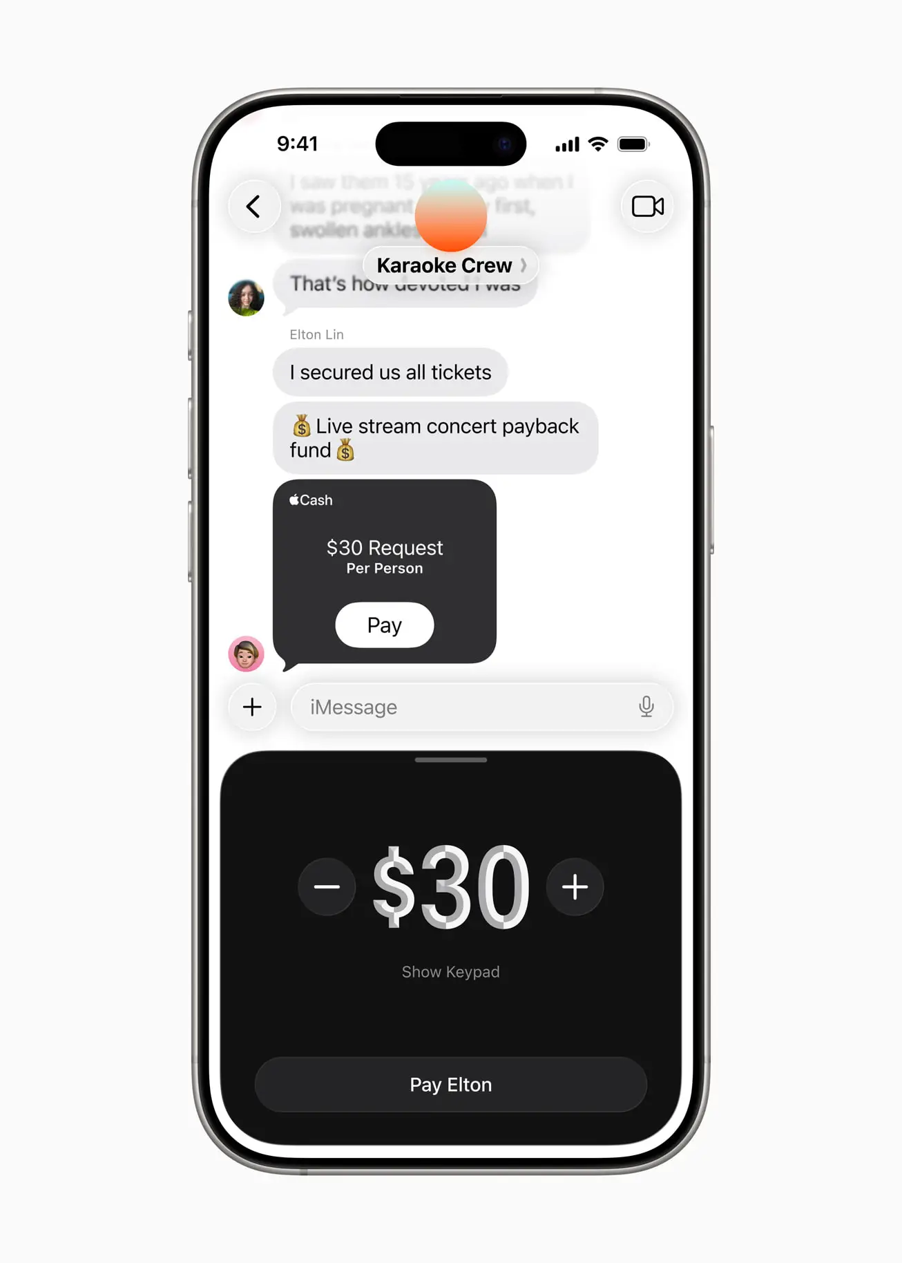 Z Apple Cash użytkownicy zyskują wygodną metodę proszenia o środki pieniężne, wysyłania ich i odbierania bezpośrednio w rozmowach grupowych w aplikacji Wiadomości.