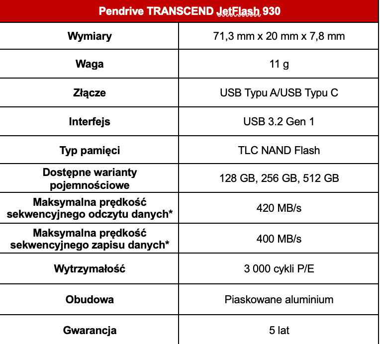JetFlash 930C to nowy, efektowny pendrive firmy TRANSCEND. Został wyposażony w podwójne złącze USB, więc współpracuje zarówno z urządzeniami z portem USB typu C, jak i typu A. Interfejs USB 3.2 Gen 1 oraz pojemność do 512 GB sprawiają, że nośnik idealnie nadaje się do przechowywania zdjęć, filmów, ważnych dokumentów oraz gier.