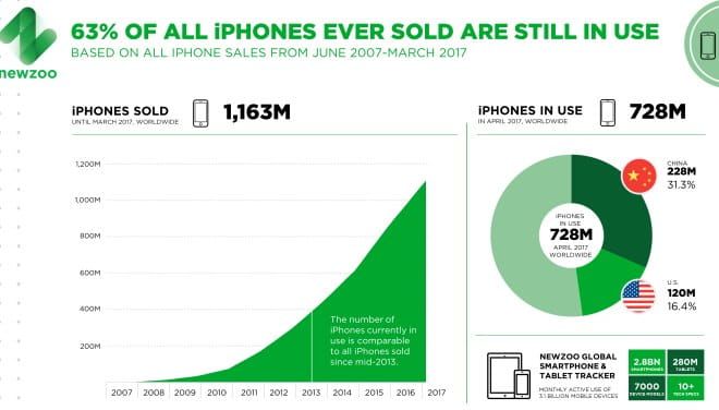 Co ciekawe badania przeprowadzone przez serwis Newzoo wykazują, że 63 % spośród wszystkich dotychczas sprzedanych iPhone’ów nadal jest użytkowana. W kwietniu tego roku na świecie aktywnych było aż 728 milionów iPhone’ów, co oznacza, że większa część jabłkowych smartfonów wyprodukowanych od początku działalności Apple nadal jest użytkowana.