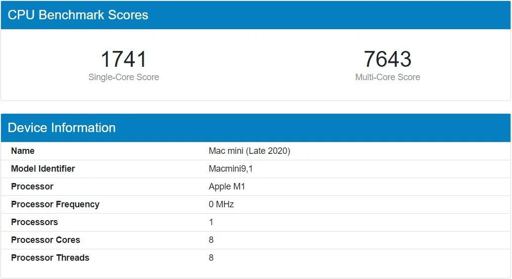 Niedawno zostały opublikowane wyniki testów benchmarkowych Geekbench 5, które osiągnął najnowszy MacBook Pro z procesorem M1. Wykazało to, że wydajność tego komputera jest bardzo bliska do MacBooka Air z procesorem Apple Silicon. Jedynym komputerem z procesorem M1, którego wyniki testów wydajnościowych nie były znane to Mac mini. Jednak zmieniło się to bo są już one dostępne. Wyniki wykazały, że Mac mini jest najbardziej wydajnym komputerem z procesorem Apple Silicon, choć różnice nie są duże. W teście jednowątkowym uzyskał on 1741 punktów, a w teście wielowątkowym wynik to 7643 punktów. Najnowszy MacBook Pro osiągnął 1719 i 7377 punktów. Wyniki MacBooka Air to 1687 i 7433 punktów.