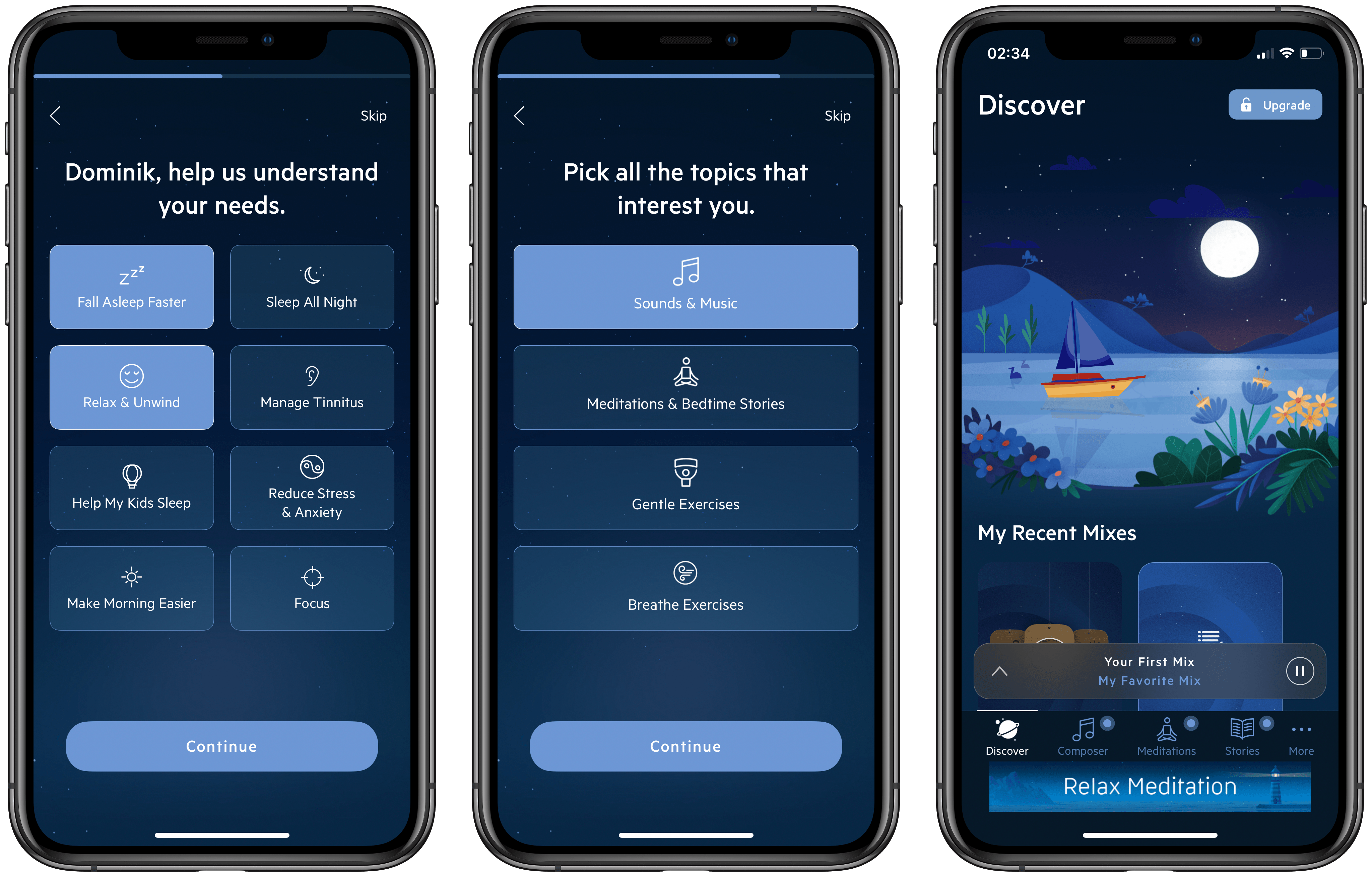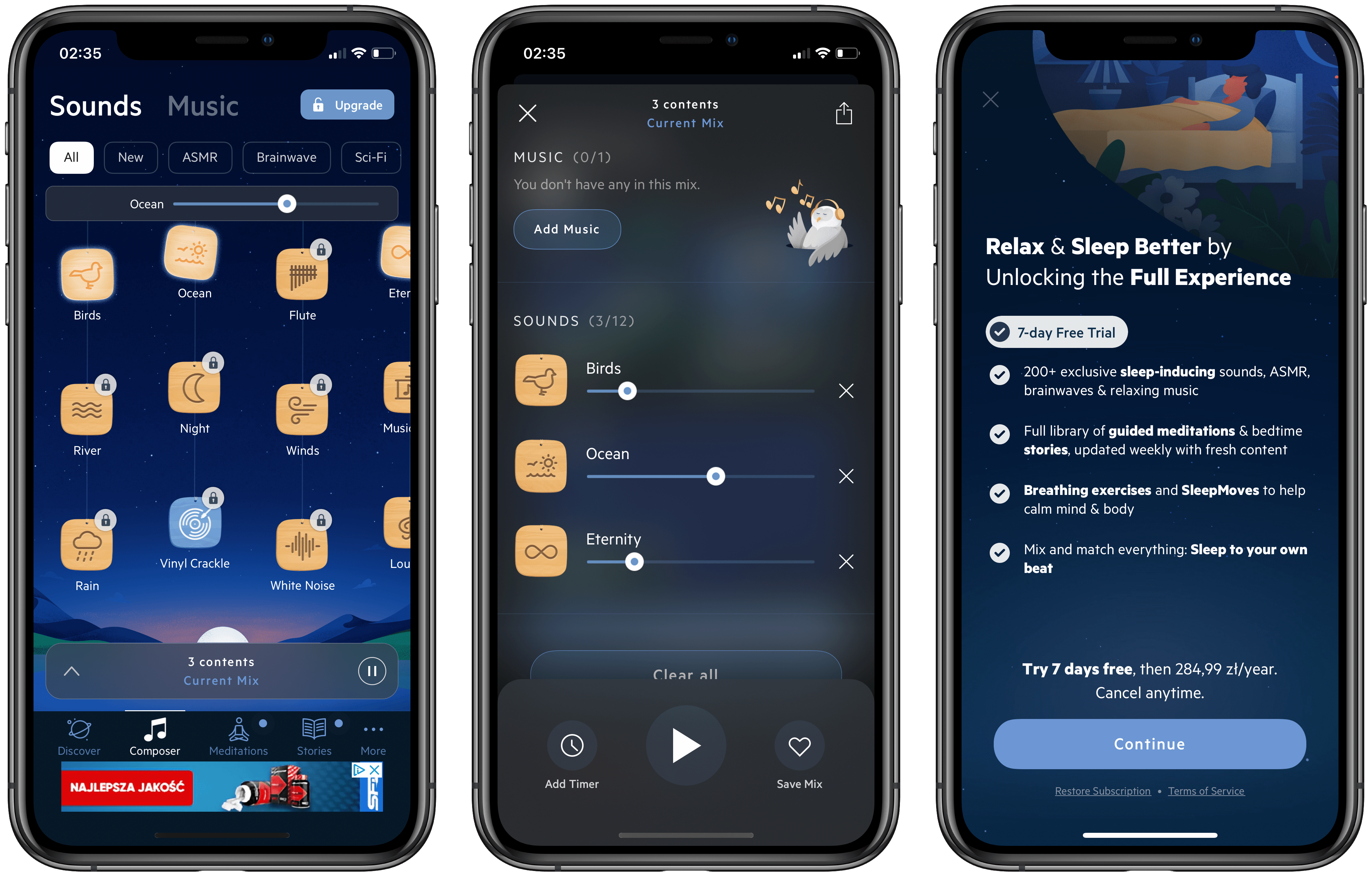 To właśnie ta aplikacja sprawiła, że powstało to zestawienie. Spędzam z nią już trochę czasu i jest jedną z moich ulubionych w tym gatunku. Tutaj sprawa jest podobna – do dyspozycji mamy trzy tryby. Łączymy się z systemowym Zegarem, aby wszystko mieć pod kontrolą – muzyka mogła wyłączać się kilka godzin przed budzikiem, a głos zamilknął po kilku godzinach snu. Tutaj czymś świetnym jest skupienie, czyli nic innego jak dźwięki zwiększające poziom naszej uwagi.