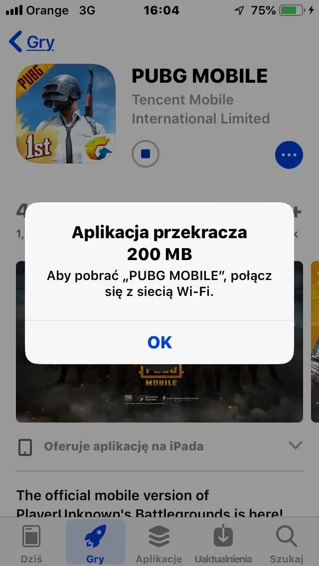 Firma Apple zwiększyła limit pliku pobieranego poprzez sieć komórkową w sklepie AppStore. Aktualnie bez Wi-Fi pobierać można pliki z AppStore, które nie są większe niż 200 MB. Sam limit jest dość irytujący dla chyba wszystkich użytkowników. Firma Apple dwa lata temu zwiększyła również limit z 100 MB do 150 MB. Najlepszym rozwiązaniem byłaby możliwość wyłączenia takiego ograniczenia w ustawieniach AppStore. Mam nadzieję, że firma Apple w końcu się zdecyduję na takie rozwiązanie, a jedyne co pozostanie to sam komunikat ostrzegający o pobieraniu przez sieć komórkową.