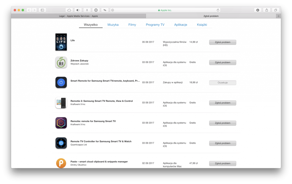 Jeśli zatem z jakichś przyczyn chcemy zwrócić zakupiony program, czy jakikolwiek inny plik multimedialny pochodzący ze sklepów Apple należy udać się na stronę. Jest to witryna dedykowana zgłaszaniu przez użytkowników rozmaitych problemów. Po zalogowaniu się na prywatny profil w ekosystemie Apple (potrzebne Apple ID oraz hasło) zostanie wyświetlona lista ostatnio zakupionych materiałów.